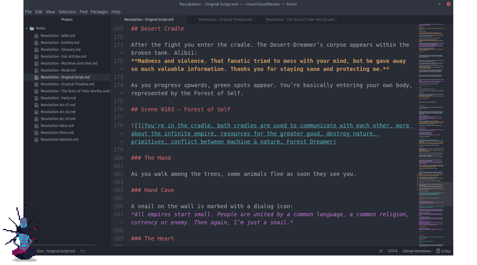 Back home from the inspiring coffee-session in 2015, I'm struggling. With plenty of graphic-design-experience on Linux, I realize that designing a video-game is completely different than the client work I'm familiar with. What’s the point of this protagonist? Why is it motivated to kill all of these enemies? What’s the story? What about politics, economics, linguistics?