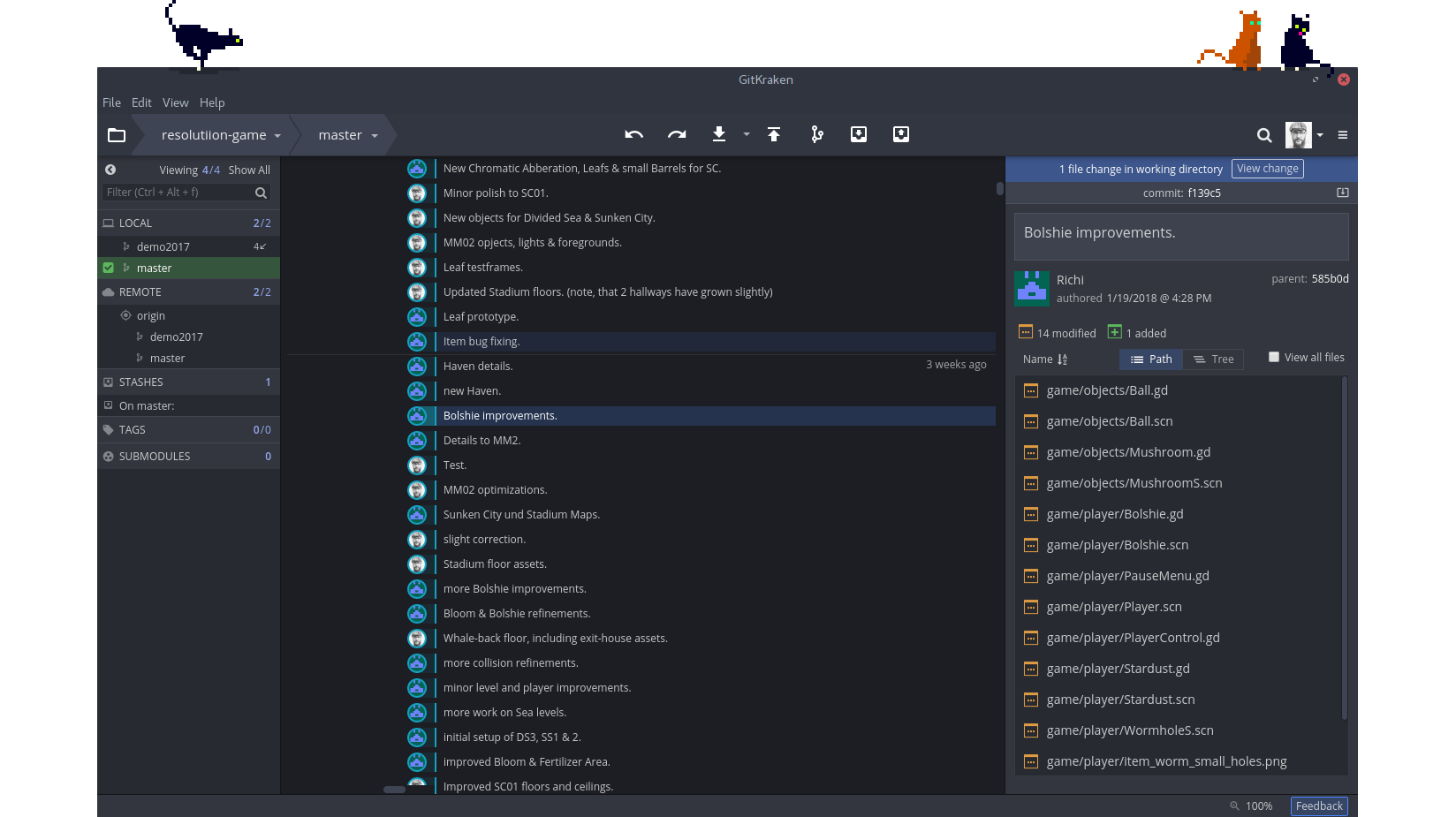 Researching game engines, Richi finds a few that are capable of running and exporting reliable code to Linux. Eventually he stumbles upon Godot. The engine feels fresh and thrives by embedding itself nicely into every open source stack. The python-like scripting language and node-tree-architecture certainly helps sell the engine to a complete beginner.