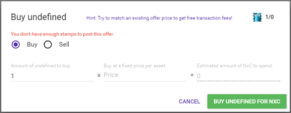 En ella podremos marcar la opción de comprar (Buy) o de vender (Sell). Ademas vemos que nos permite elegir la cantidad que queremos comerciar, el precio y la cantidad de moneda. Por ultimo arriba a la derecha vemos el icono de un barril con las siglas BTV son los llamados Stamps producto necesario para poder crear nuestra orden de compra/venta y que en este caso nos aparece 1/0 lo que quiere decir que no disponemos de ellos. Si os fijas al no disponer de ninguno en este momento nos aparecen los siguientes mensajes:
