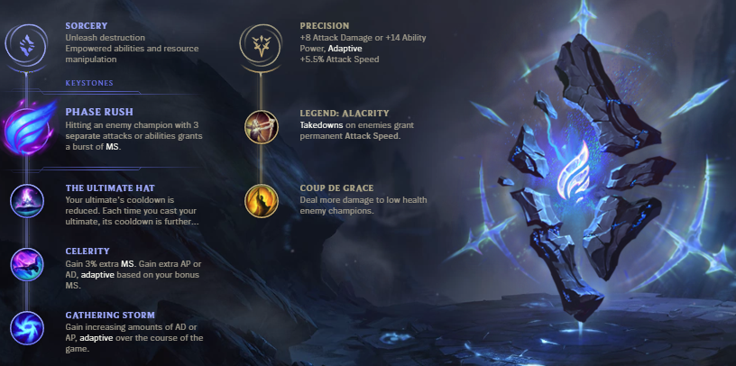 Otherwise the rune-page is pretty standard with the ultimate cap for more shrooms, celerity for that extra move-speed/damage, and gathering storm for the scaling damage throughout the game. The two precision runes, Alacrity and Coup de Grace are to help Teemo execute/scale better into the late game.