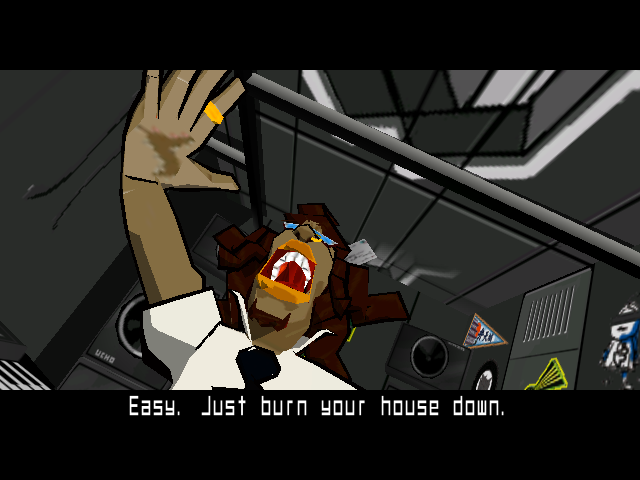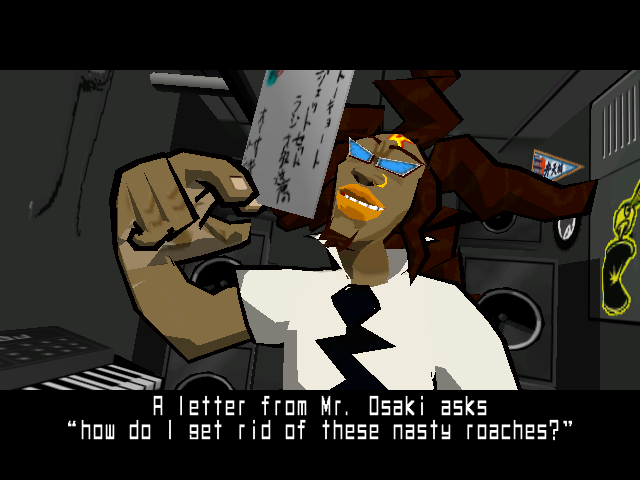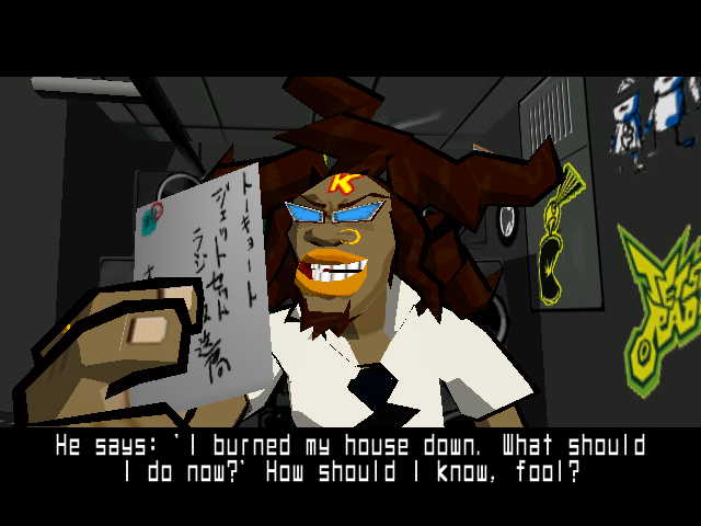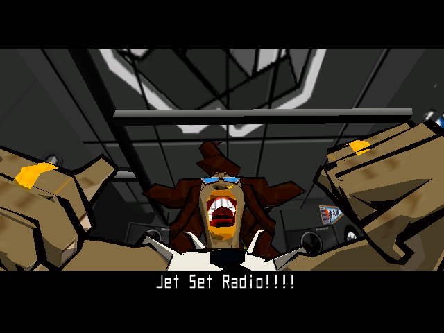 One of the biggest selling points in the game has to be "DJ Professor's K"'s dialogue, this man is the DJ of the pirate radio station by the name of "Jet Set Radio" and he's one of the reasons why I find myself coming back to this game again and again; despite the fact that he always says the same stuff with some variations, he's always so full of energy and his lines always feel natural.