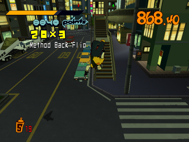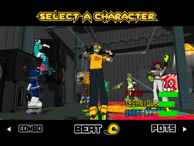 Don't expect a deep story or something with this game, Jet Set just gives you whatever you need in order to understand the setting: There's teenagers in Tokyo using magnetically enhanced roller-skates and forming up gangs that mark territories with graffiti and then there's the police trying to stop them from being a nuisance, because painting graffiti on the walls without permission and recklessly skating is kinda illegal.