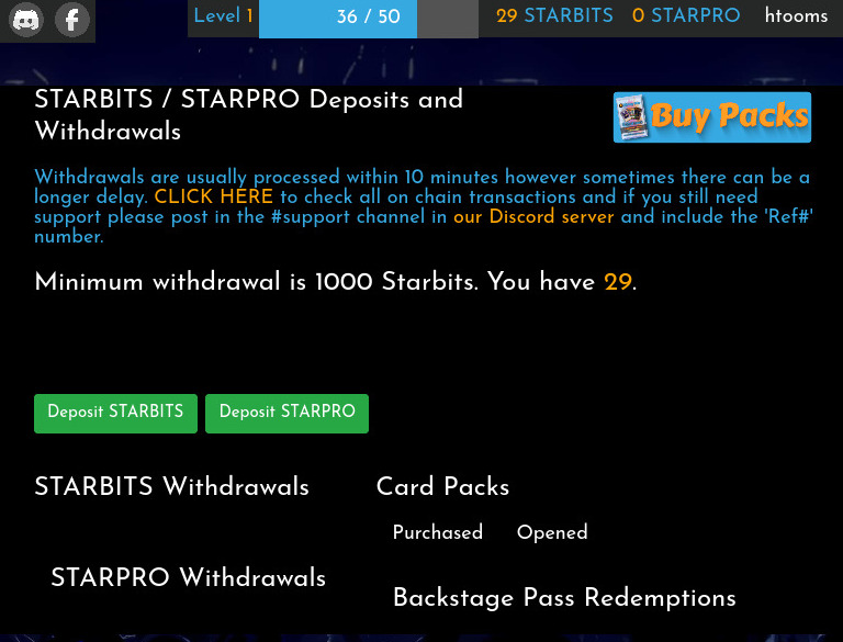 The next step as I run my missions is to deposit my newly purchased starbits, and buy a card pack!