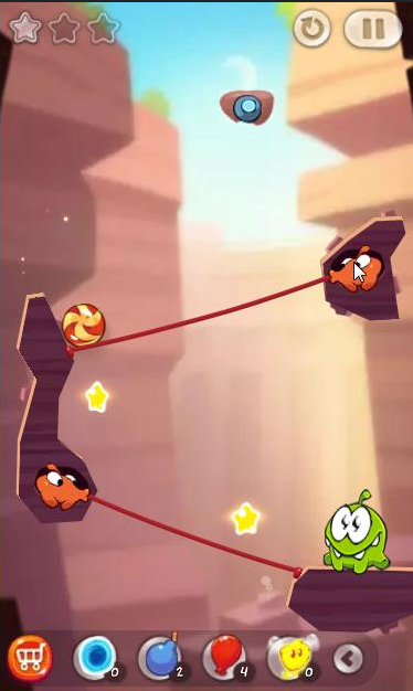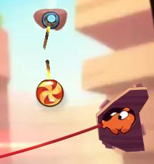 This is a basic level 26 show here Om Nom new friend called Lick if not mistaken he comes from the desert, we can see from the picture left and right there is a rock or a high cliff and very deep .... Lick also has an outside expertise usual, curious to see the color and shape. Om Nom abu Lick changed his orange he was funny and also like to hide behind rocks ... I really like to see with a cute face and unique shape. See the picture below: