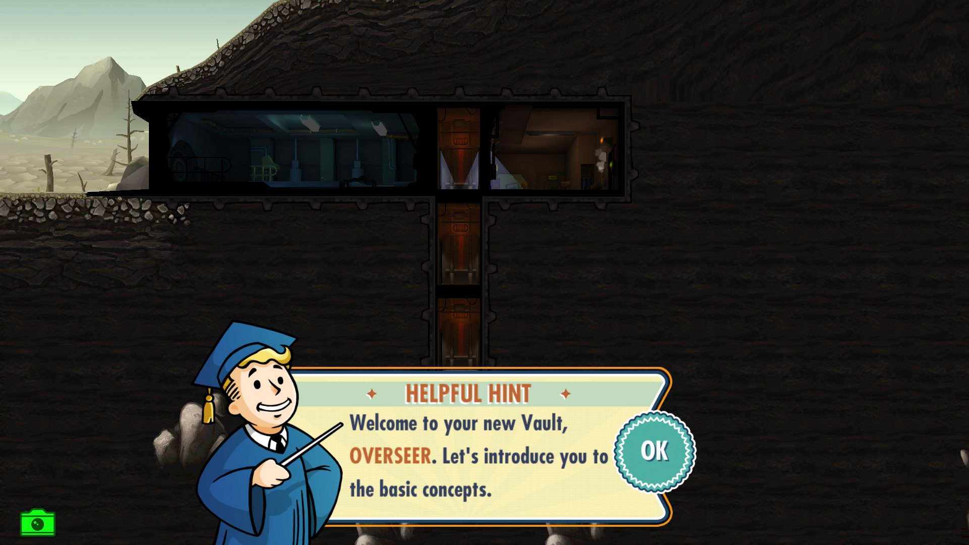 And you can start building the best shelter for everyone who is searching for some shelter. You start with nothing. Your vault is just an entrance and one living quarter, and it's up to you to improve it. Of course, there is a tutorial to explain to you every little fart.