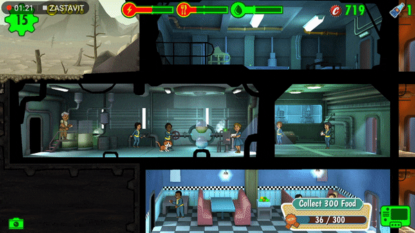 The graphics are quite elaborate because room upgrades are known, and the best thing about it is to zoom vault in and out. In the furthest position, the vault is displayed in 2D, and when zoomed in, it switches to 3D. The dwellers are drawn in classic fallout style and fit perfectly into the environment.