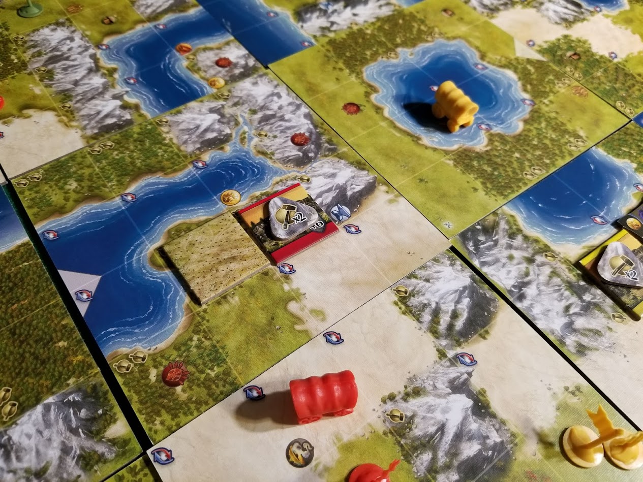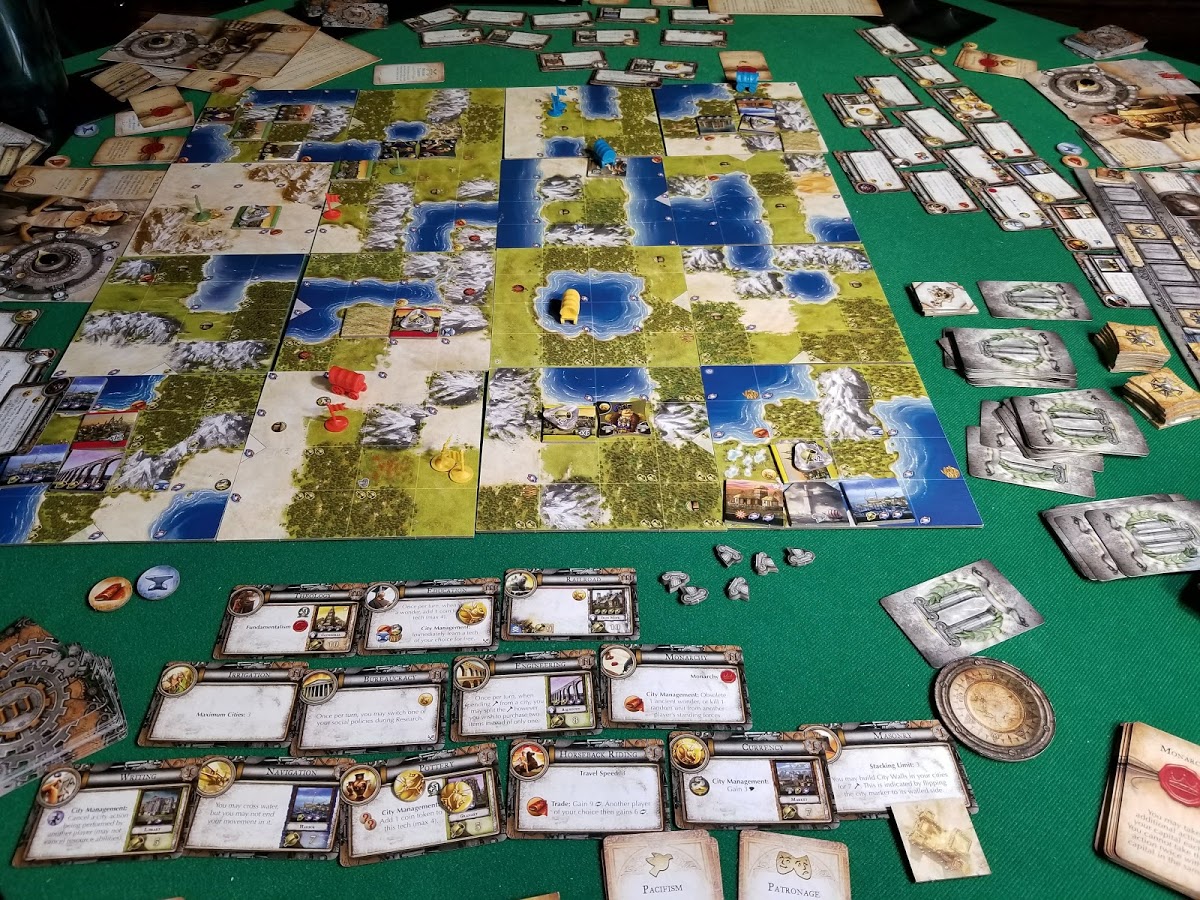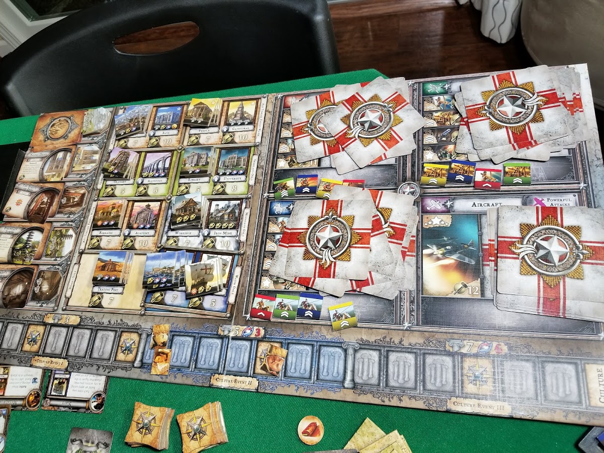 Much like the computer game, you start off with almost nothing, and have to build up by acquiring techs and building buildings around your city. Here in the following picture you can see the market board. On the very left are Wonders (Ancient, Medieval and Modern) you can build, as well as ll the buildings, which are unlocked by techs you acquire as you go. The bottom row is the culture track. By advancing up the culture track you can get powerful culture cards like obsoleting other tribe's ancient wonders or learning techs for free. On the right are the army cards. If your armies clash on the board you must fight with the army cards, but woe to the loser as there is looting involved!