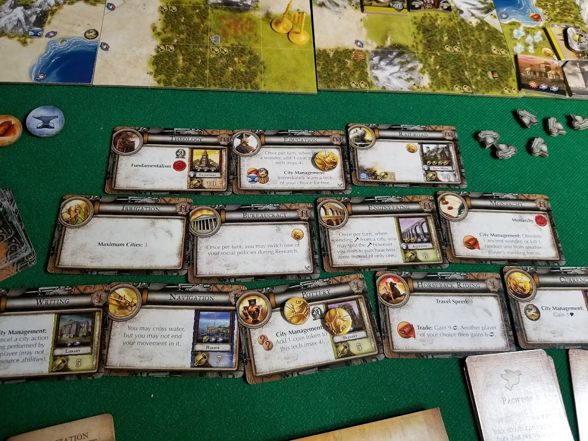 I did do well on my tech pyramid though. (see below) One flaw I see with this game is that the winner-by-tech-pyramid should not count, because it is too easy to build up. I think the 3 other ways to win are much harder (advancing up culture track, conquering a capital city, or gaining an economic victory), and its more fun to focus on those.