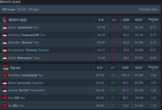 First match was BOOT-d[S] vs TyLoo with TyLoo being the winner, these matches are best out of 3 and unfortuanatly Boot-d[S] is out of the race. These teams had a first match on the iconic Dust 2 map with of course TyLoo on to. Second match was on one of my personal favorite maps, Mirage with another win from Tyloo, kicking Boo-d[s] out of the competition.