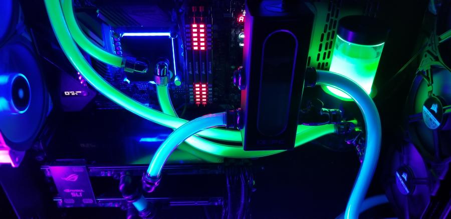 When it came to watercooling this setup, I had to keep my old loop for my GPUs. This mainly is due to the cost but it worked out very well. For the CPU with it being the i9 9900k, I ended up getting an Alphacool 420mm ut60 radiator. For the pump and reservoir I went with the EKWB Xres 140 Revo D5 RGB PWM and EKWB Velocity CPU Block.