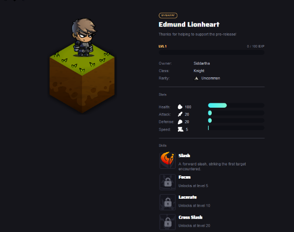 If you would like to play the demo and claim your free hero in game then just register on site: https://www.kingdomsbeyond.com/?ref=siddartha and link your ETH address using Metamask. And you will get a hero like this in your inventory.