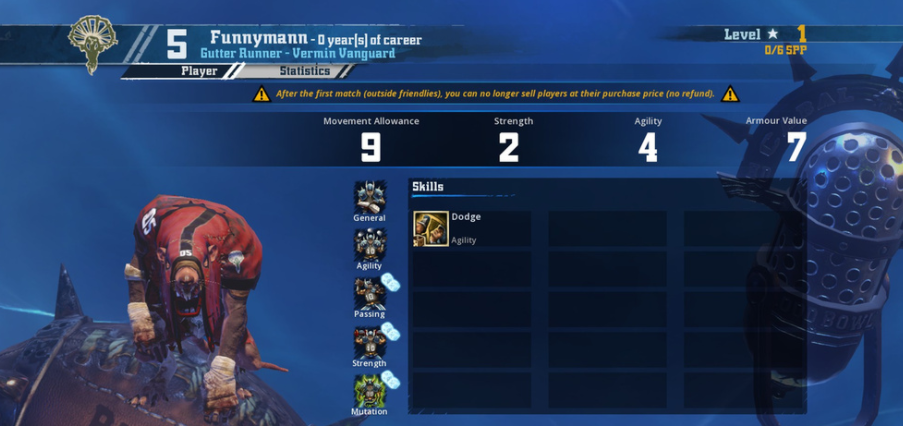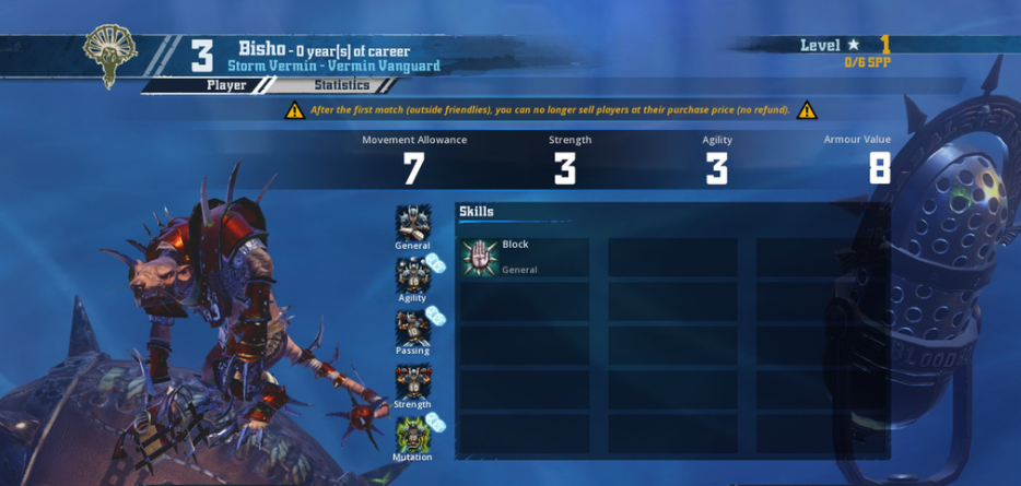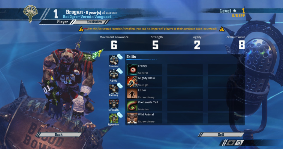 A vital part of any team composition, the Big Guy takes up the position of the Middle Linebacker. He's big, he's hulking, and he brings a world of hurt to the opposing team the moment the game starts. The Rat Ogre in specific starts with a couple abilities, which you can see above.