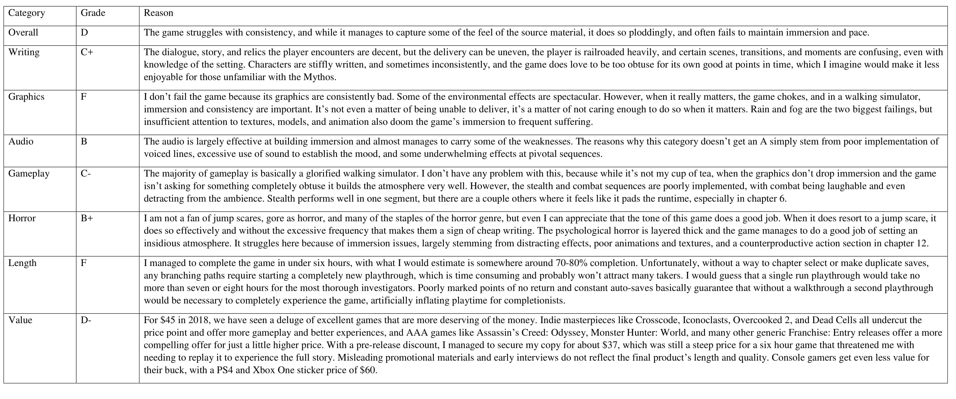 Call of Cthulhu is a franchise that I have enjoyed since I discovered it. I’m not a huge fan of horror, but mostly because it leans on shocking gore, jump scares, and other cheap tricks. Lovecraftian horror, on the other hand, largely draws on psychological manipulation, questions of sanity and perception, and, ultimately, questions about the nature of humanity in the face of a larger cosmos. When I heard it was getting another game in 2018, I figured it would be worth a shot. I don’t regret getting the game, but I also cannot recommend it. I have included a link to my review of the game on Steam, which ends largely because I ran out of characters to write with. I touch on many of my points there, and I won’t necessarily address them here again in depth. Rather, look at my scorecard and I'll explain where and why it struggles.