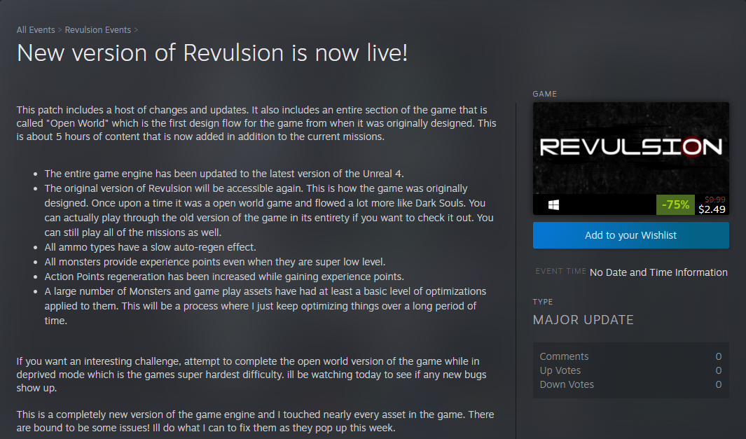 The original version of Revulsion will be accessible again. This is how the game was originally designed. Once upon a time it was a open world game and flowed a lot more like Dark Souls. You can actually play through the old version of the game in its entirety if you want to check it out. You can still play all of the missions as well.