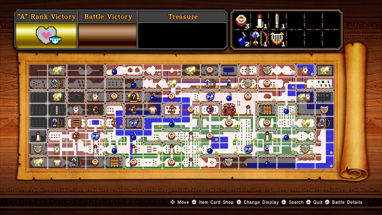 How it Works is it's basically a Board game of Sorts, You go across the Map(Which is 8-bit Variations of Zelda Maps) and Clear a Challenge on a Tile Which will usually be something like "Kill This amount of enemies" or "Kill all of the boss enemies" Once you do you can earn some Item Cards which you can use on the Board to Uncover secrets and allow you to earn more rewards, Like Character Costumes, new Weapons, and even new Characters. This mode is so fun mainly because it's Quick and Easy to Jump into. And this is clearly where most of the content went to, Considering that there are 9 Adventure mode maps, each with their own Challenges, Rewards, and Gimmicks. For example, the Termina Map has a Time Limit, the Twilight map has Tiles that Restrict what you can do, Koholint Island Requires you to Clear specific Challenges before you can Finish it. the Lorule Map has you teleporting across two sides of the map.
