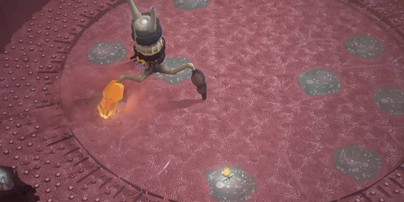 In this boss fight for example, you are facing off against some sort of jumping guy that starts off with 4 legs and is quite slow. If you have ever played a videogame before you already know that as the number of legs gets lower, he gets faster. The red areas on the floor make you walk slow, and you can launch yourself into the air in the white circles.