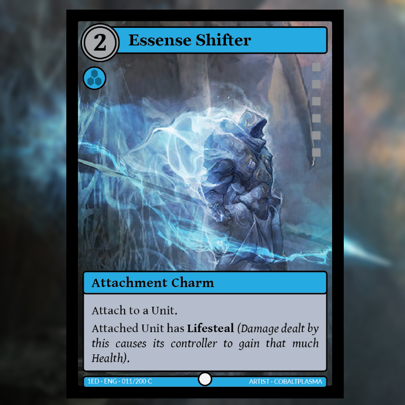 Today's card is the first charm show. Charms are cards that stay in play after being played (Objects in game lingo). However this one also attaches to a unit and will leave when the unit leaves. This one happens to give the attached unit Lifesteal.