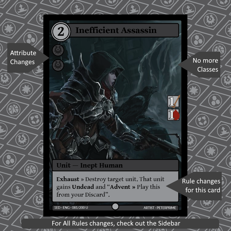 Second rules of the games have changed. Right out of the gates, the classes on cards and characters are gone. No more classes. Second, the attributes will have changed. Just like before, any card may be turned into Aether but each card (with some exceptions) will contribute their Attribute requirement to Attribute pool that the player has. Then to cast a card, one must have both the Aether required in its cost but meet the Attribute threshold for the card.