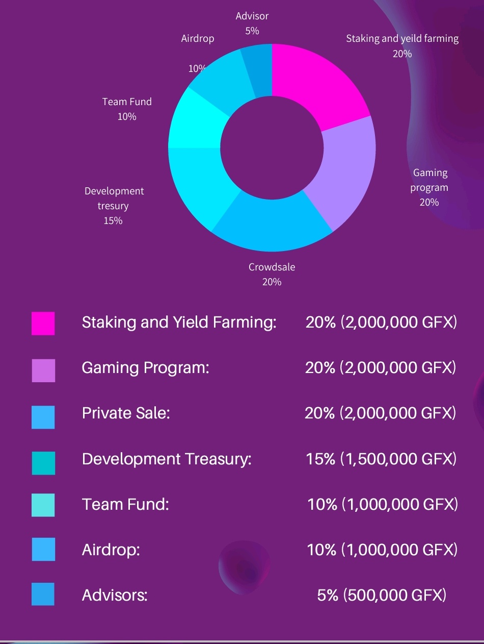The native token of GamyFi is GFX, The GFX token will be Community driven with yield Farming protocols and other forms of distribution like staking and gaming programs.