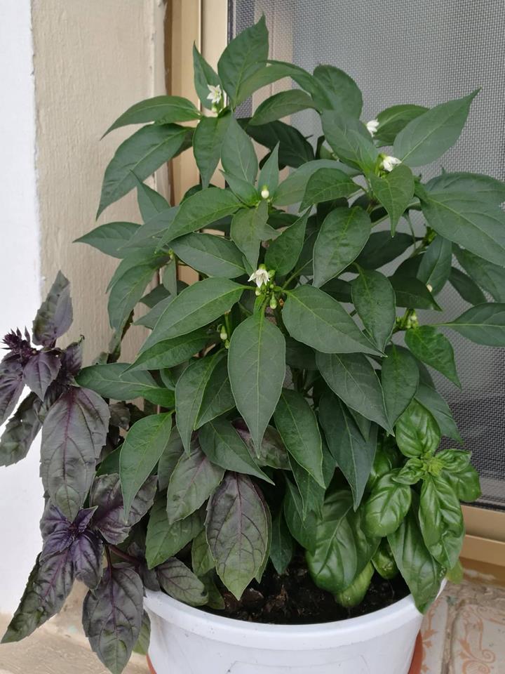 days ago I posted the photo of my triptych of plants, basil, black basil and hot peppers, now these little white flowers mean that in a little while the fruits will come out!