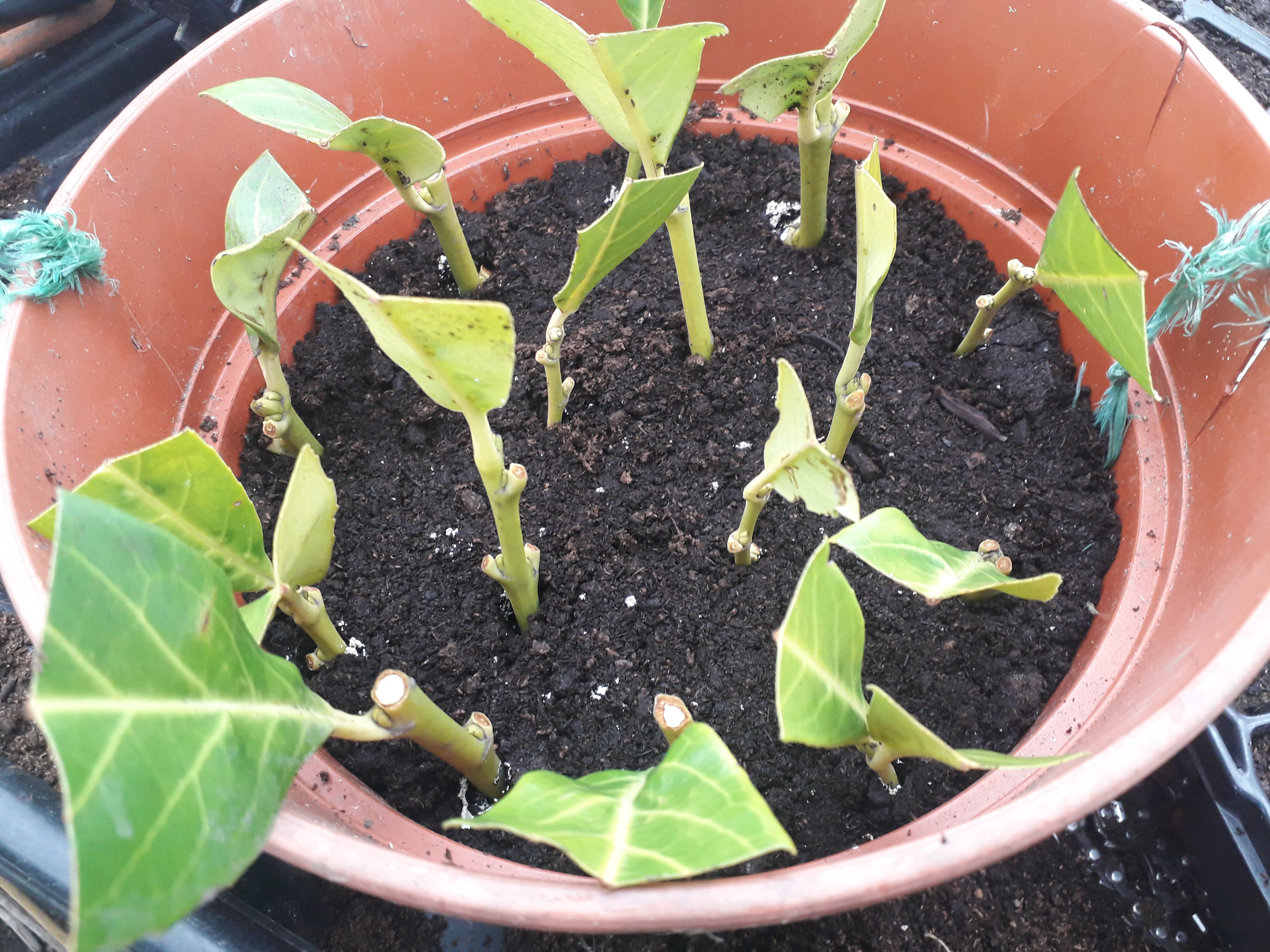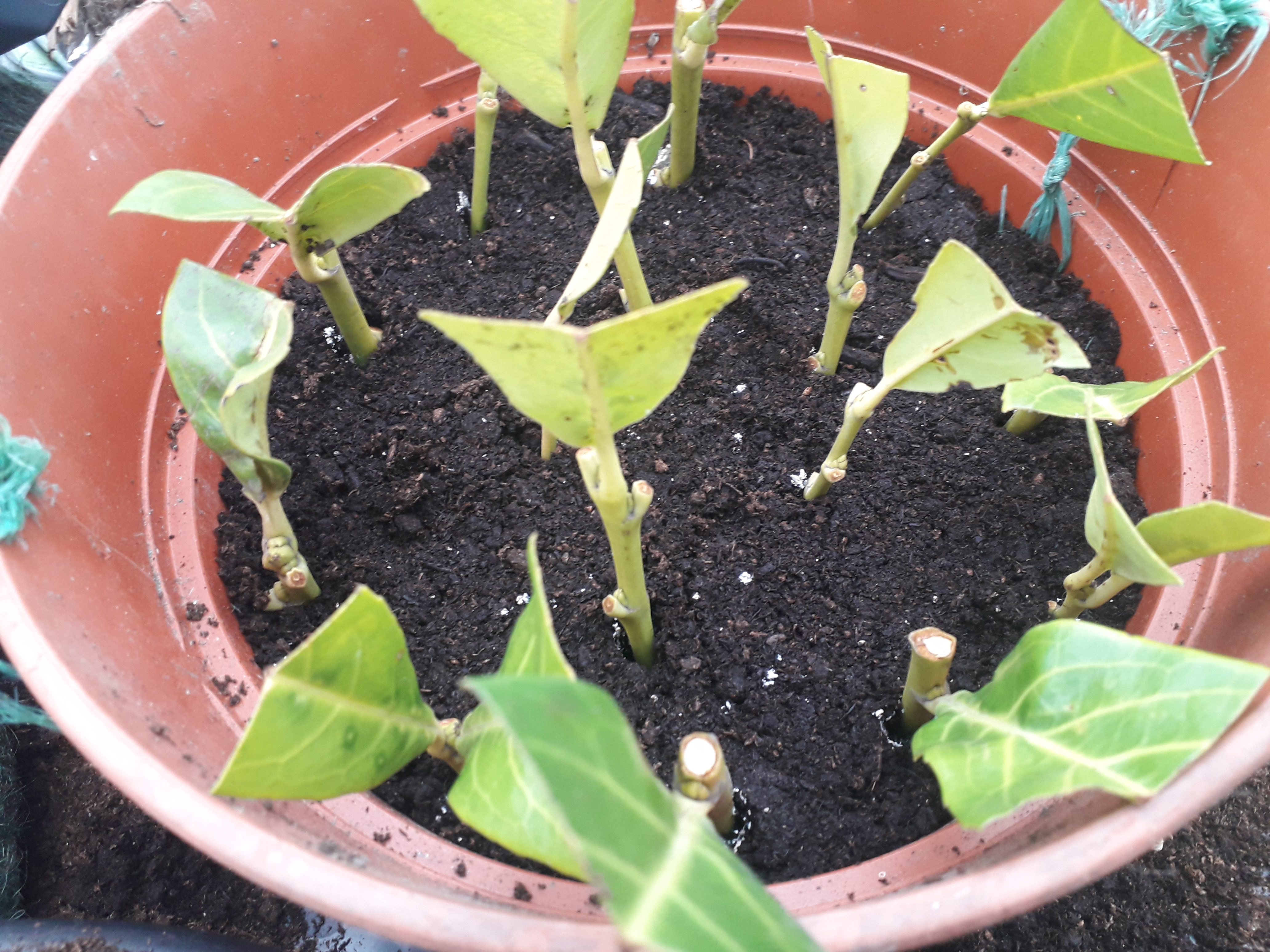 and in another tall standing pot I have normal compost that has 15 cuttings in, both have had rooting hormone on the stems to help with growth of the roots, I would have used honey like I normally do but with the out break at the moment there isn't any on the shop shelves.