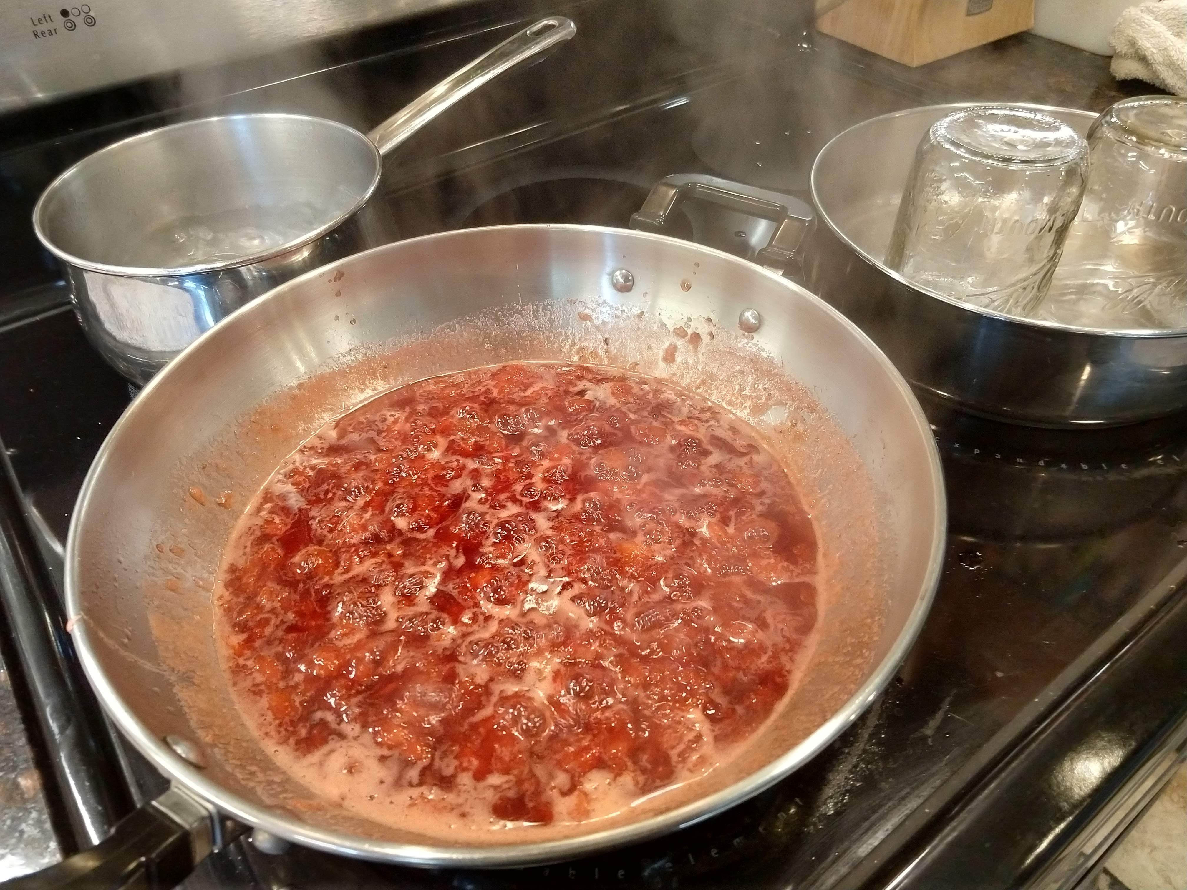 Sorry, no pictures for this one. The apple contains pectin which aids in thickening the mixture. I liked this approach vs using store-bought processed pectin. The shredded apple dissolves pretty quickly into the mixture once it begins to simmer. It's nice to know that all of the ingredients in this recipe can are natural (yes even the obscene amount of sugar I used).