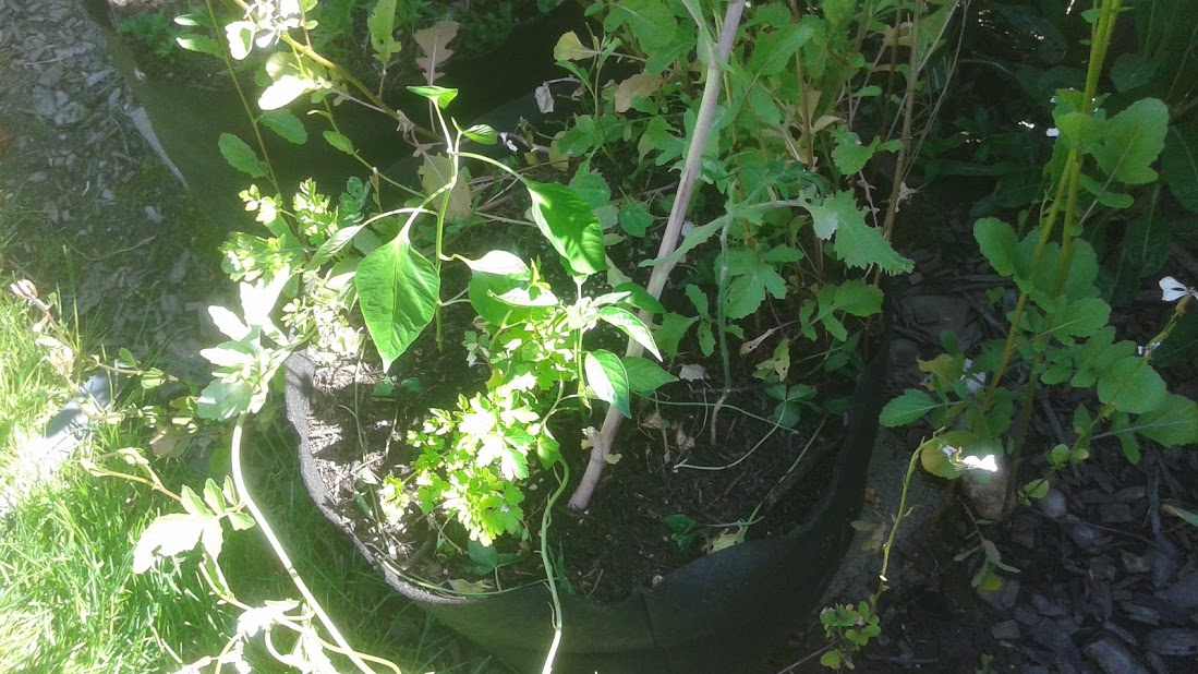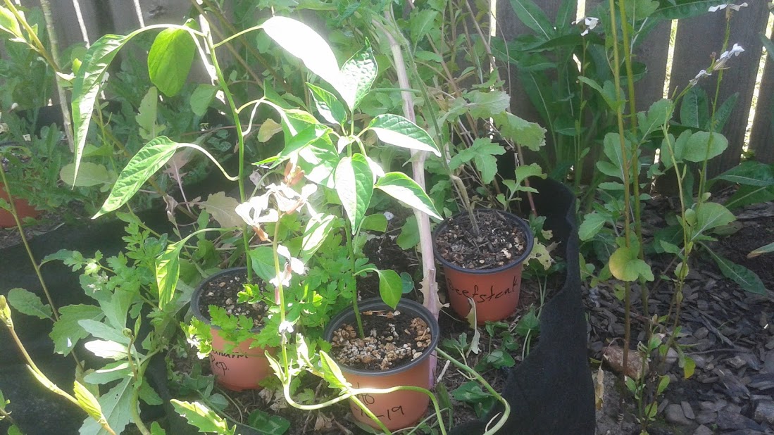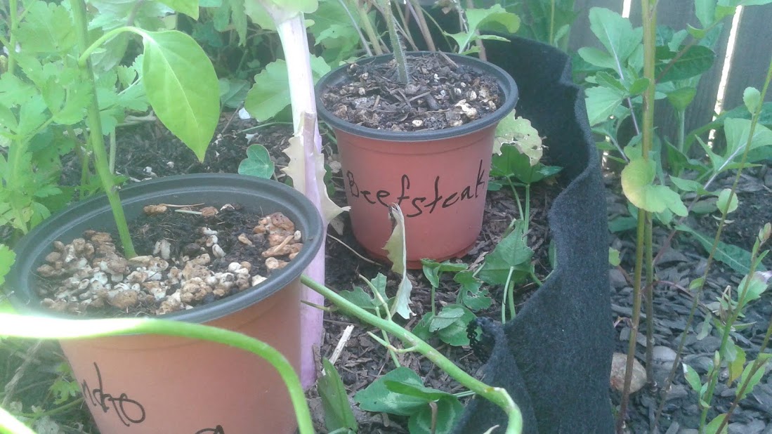 Behind them will be the beefsteak tomato. It's a little bit lanky, and seems to need more root space in order to develop, because it has been discarding leaves for all the new ones it puts on.