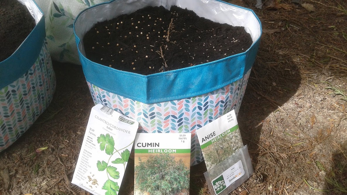 My friend gifted me with these little planter bags, and I filled them with super rich fish compost. These bags are interesting in that they only have one hole in the bottom, but the bag is lined with a clear plastic. That means it's going to keep the soil very humid with moisture. I think this will be ideal for herbs that love moisture and warmth.