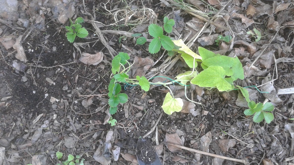 I planted the pumpkin vine on it's side so most of the leaves would be facing upward to gather sunlight. Hopefully the roots will be deep enough. I have plenty of compost surrounding the area that works as a mulch to keep the roots mulched. The wooden bamboo stake, I had to twist it out of the wire, as it no longer is being used to hold the vine upward. When the corn and bean plants start growing here, they will form the three-sisters relationship, I hope, and the pumpkin vine may even start to climb up the corn stalks or the fence.