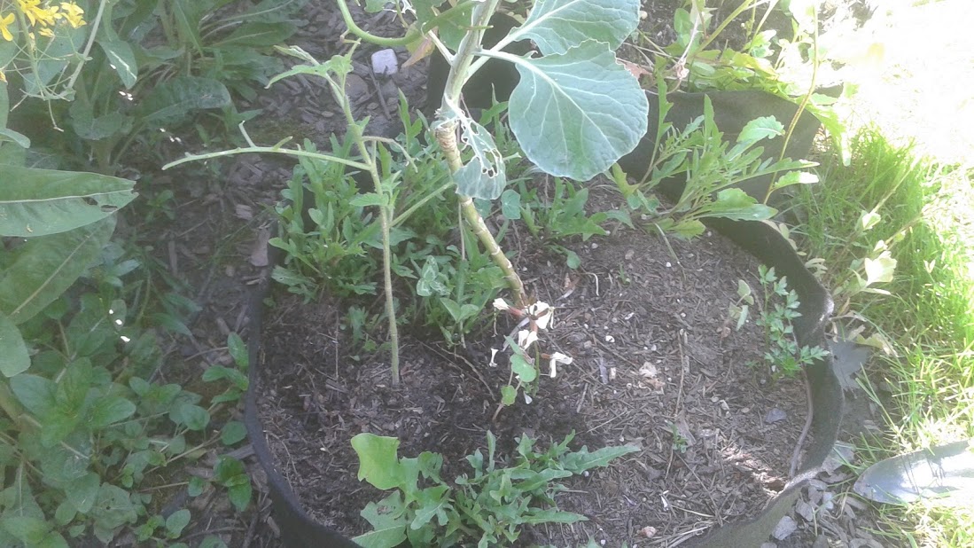 The tomato in this bed probably won't like growing under the brussels sprouts stalk, but there is plenty of space and nutrients to share. As soon as seeds can be harvested, the brussels sprouts will be removed in a few weeks.