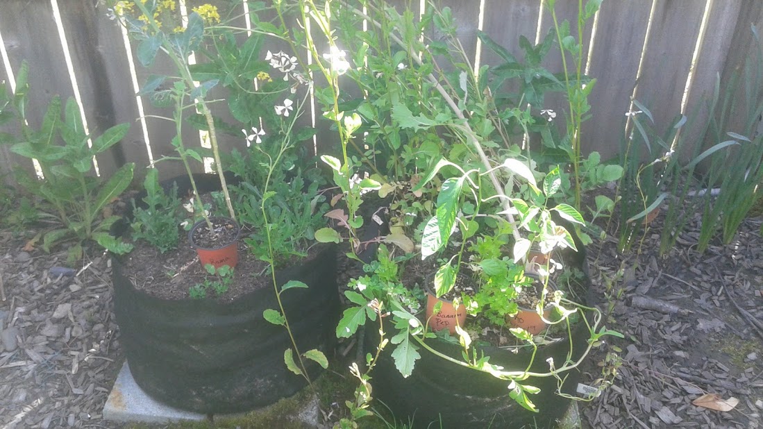 Lots of arugula and clovers growing all around. It's all going to seed. There's a big lump of daikon radish next to the pepper I'll be planting. It's also going to seed, so we'll see what happens. I think growing things in succession like this will be a good thing for the garden, especially for plants that have different levels and needs. Think my plan will work?