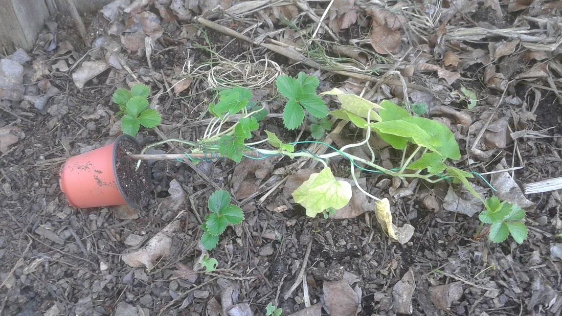 After hardening off the peppers, I am now hardening off pumpkins, tomatoes, and even some melon vines. I decided to take the strongest looking plants that have been hardening off well, and plant them deep into my garden bags. Here, I laid them out close to the position they will be occupying.