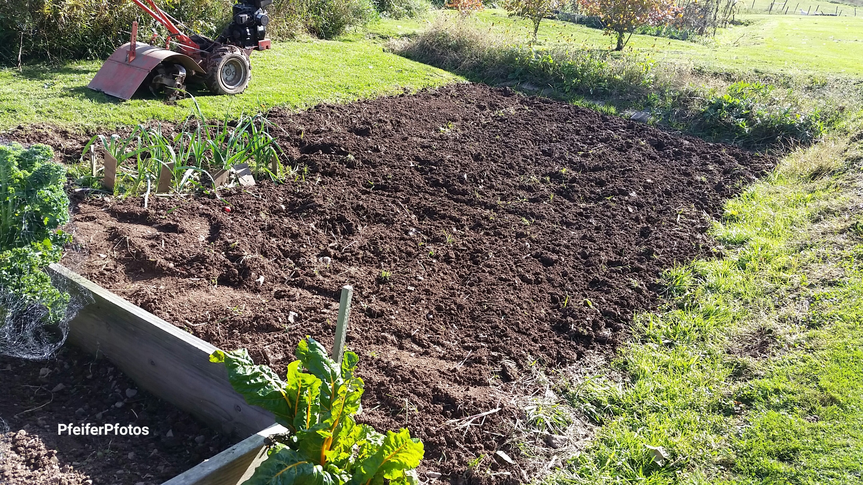 As you can see, after tilling, the garden looks 100% better. If you're wondering what the small patch of plants are on the left in front of the rototiller, they are leeks. They were planted late (I started from seed) and stuck in the potato patch where a few hills didn't come up. There is another small batch in the upper garden. Leeks are cold tolerant and the flavor can even be enhanced by frost. I will let them grow and they can be used right up until the ground freezes.