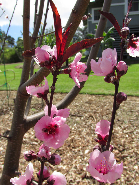 It tastes like they took the best of a Santa Rosa or Laroda plum and stuck it in a peach. Adding to its flavor is the beauty of this tree, as its new growth is purple. In springtime, after a beautiful pink bloom, the tree looks like an ornamental red cherry-plum tree of the sort that adorn many suburban neighborhoods in the United States and Canada. But the older leaves gradually turn green, leaving purple pigment on the tips. This tree is a fast grower and very prolific. The Nectaplum is a highly ornamental plant as well as a producer of good fruit.