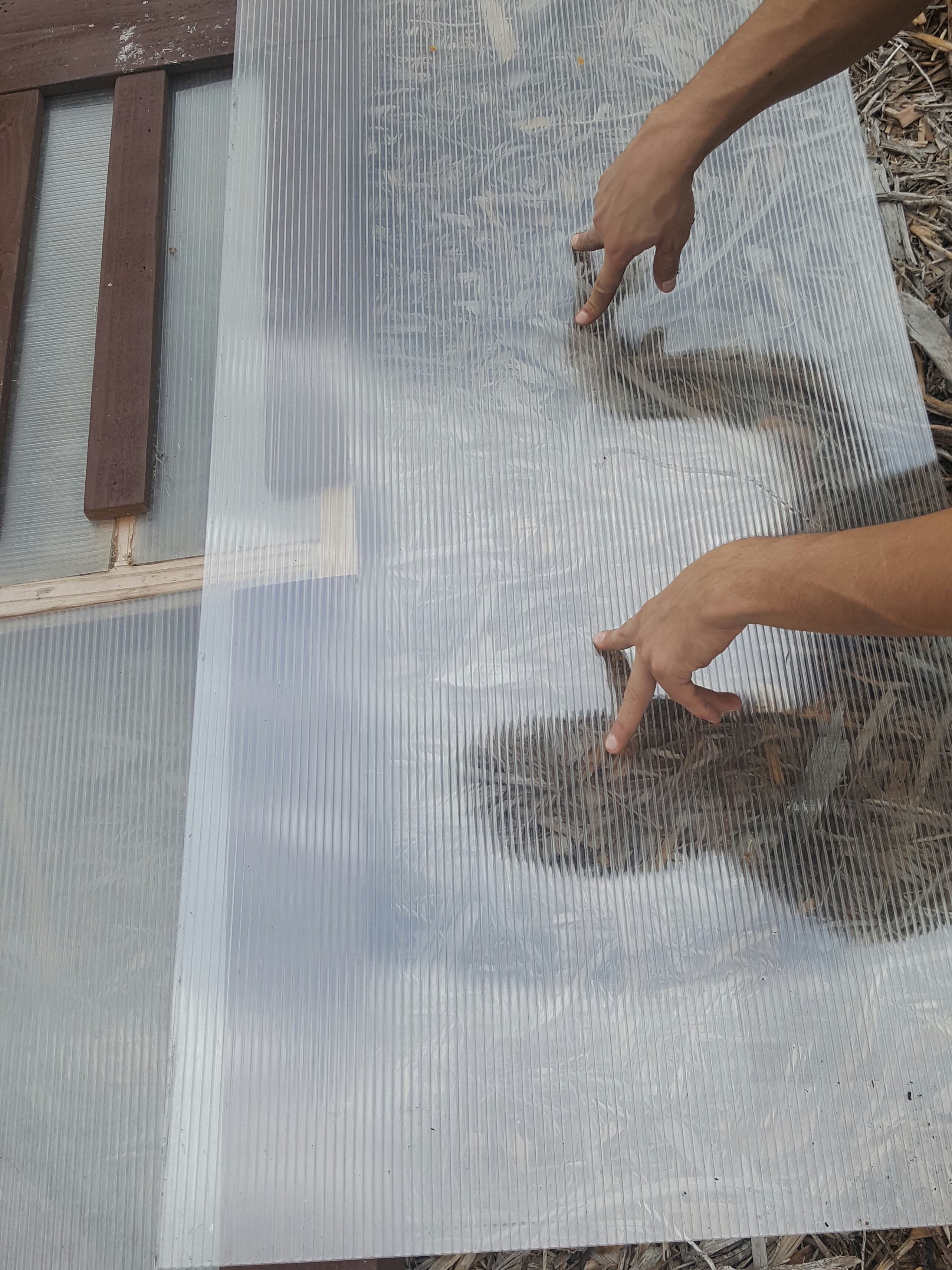 Now for the fun part. We used polycarbonate, Im sure plenty of other things could be used- get creative! We actually got a bunch of it free from someone getting rid of their greenhouse, so check your local craigslist. Anyways, Find the center and fold them in half.