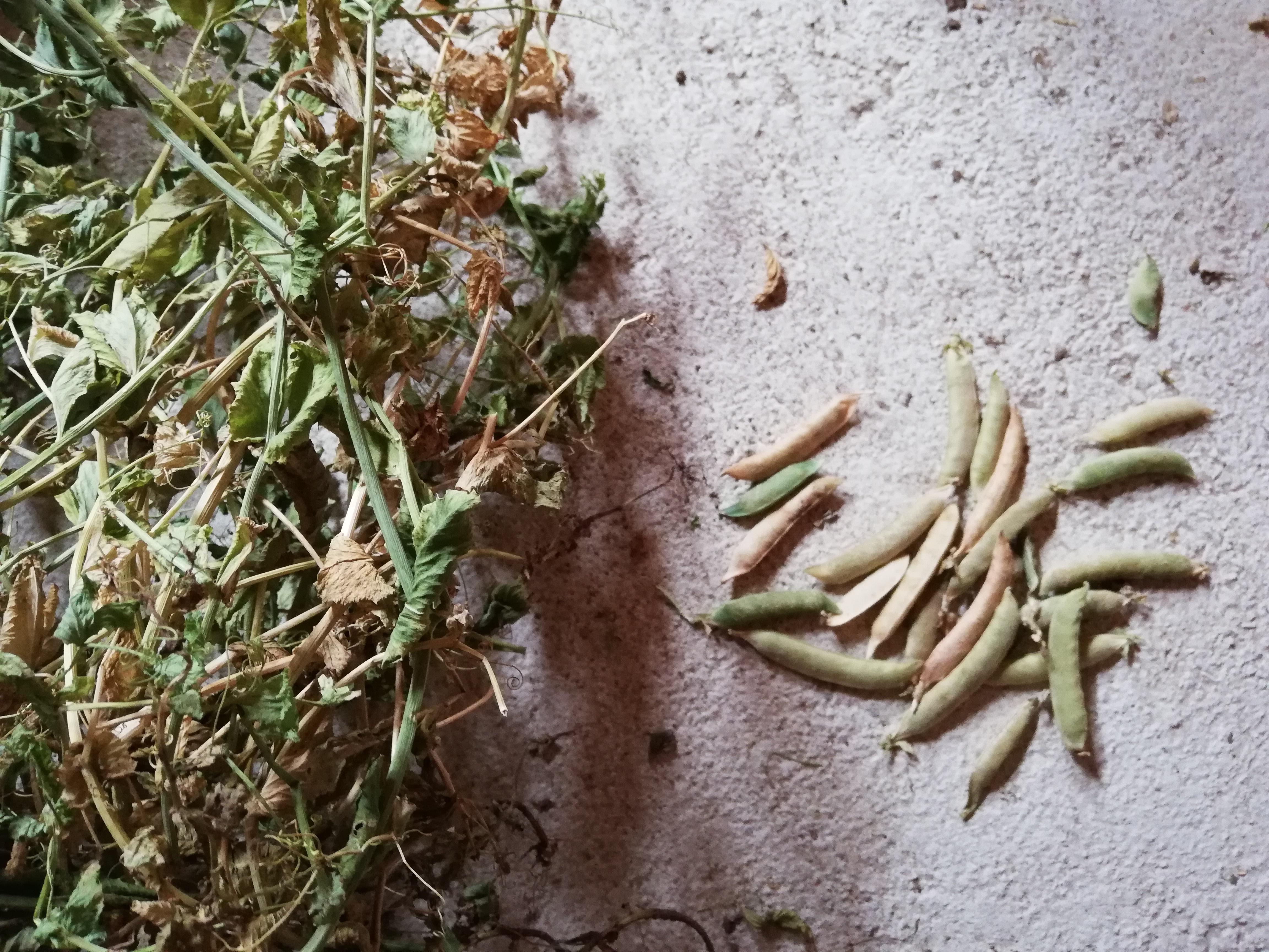 Remove pods when is dry and to pod it and use little green balls called pea for seeds for next time.