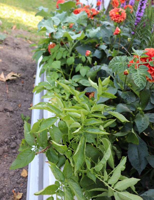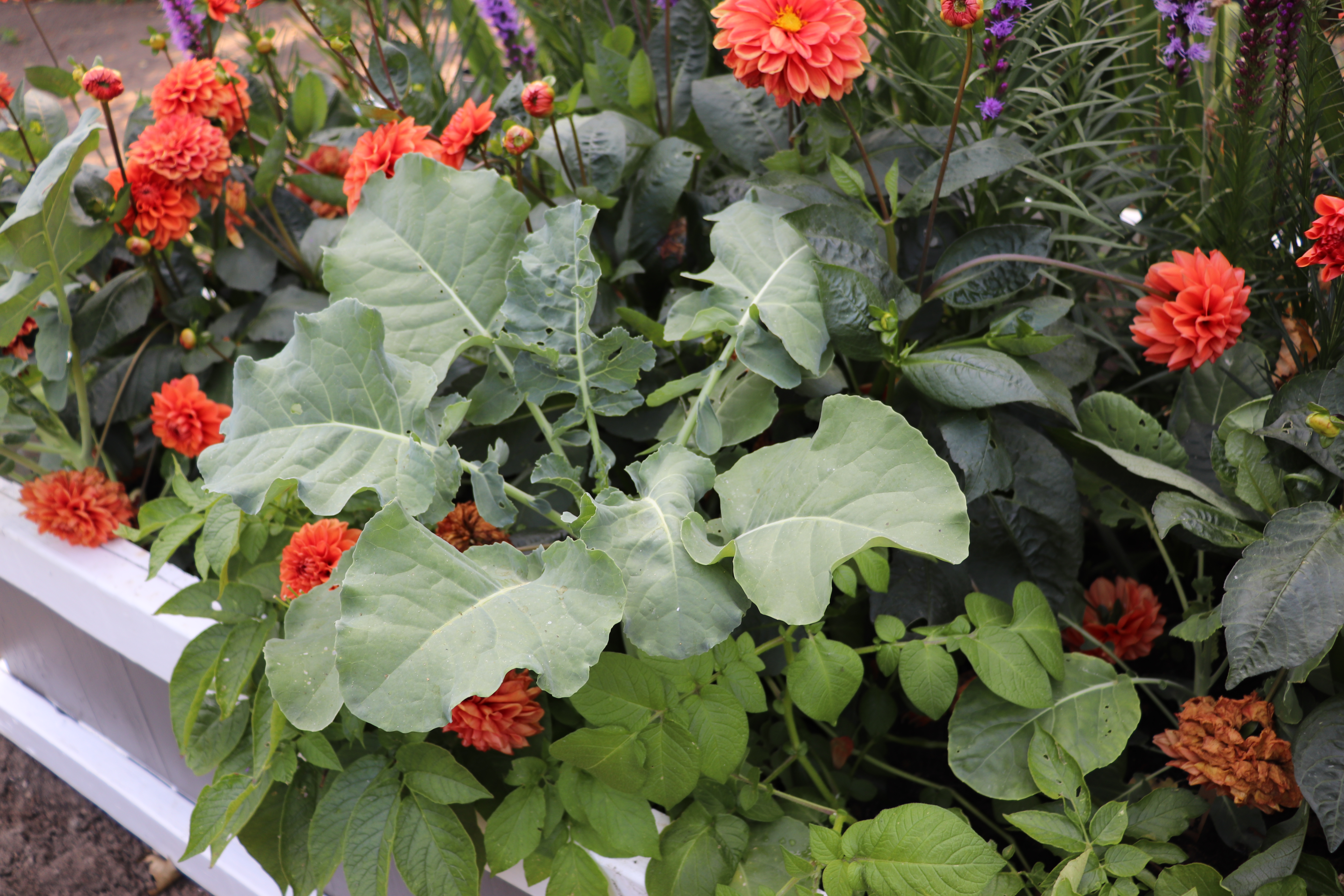 I initially only wanted this planter to have flowers, but ultimately I couldn’t help myself and planted potatoes, romaine lettuce, brussels sprouts, broccoli, and tomatoes in there too.