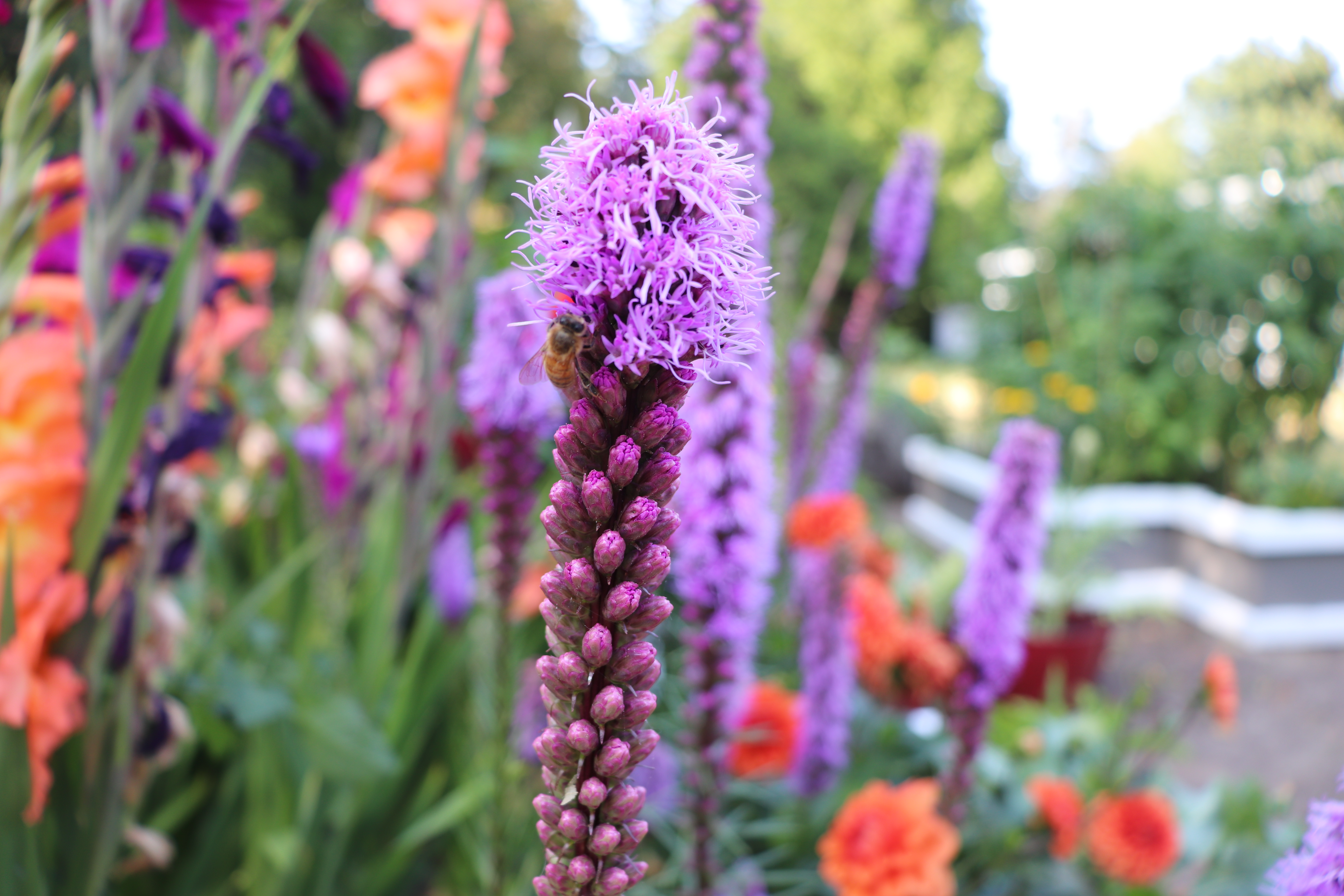 We planted the bulbs in early spring and by mid-summer, the growth of this planter was explosive! Also, one of the benefits that I realized in hindsight of planting these bubs (besides just being so dang beautiful!) was the amount of bees they would draw in to pollinate my other plants. I’ve never seen so many different kinds of them! Fluffy bumble-bees, little honeybees, you name it! They keep to themselves and don’t bother us at all when I’m working out there, and they sure seem like happy little guys. I truly believe that the amount of bees in the garden this year were one of the big reasons why my veggies and fruits have been so successful!