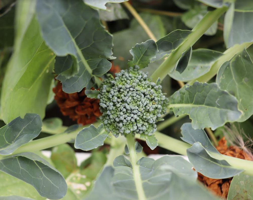 I planted a much later, second round of broccoli (my first round was in my first planter) and planted two broccoli plants and two brussels sprout plants spaced much further apart than in the first planter. The first broccoli plant is already producing a head of broccoli, although I’m not seeing a lot of action with the brussels sprouts yet. I’ll keep trying!