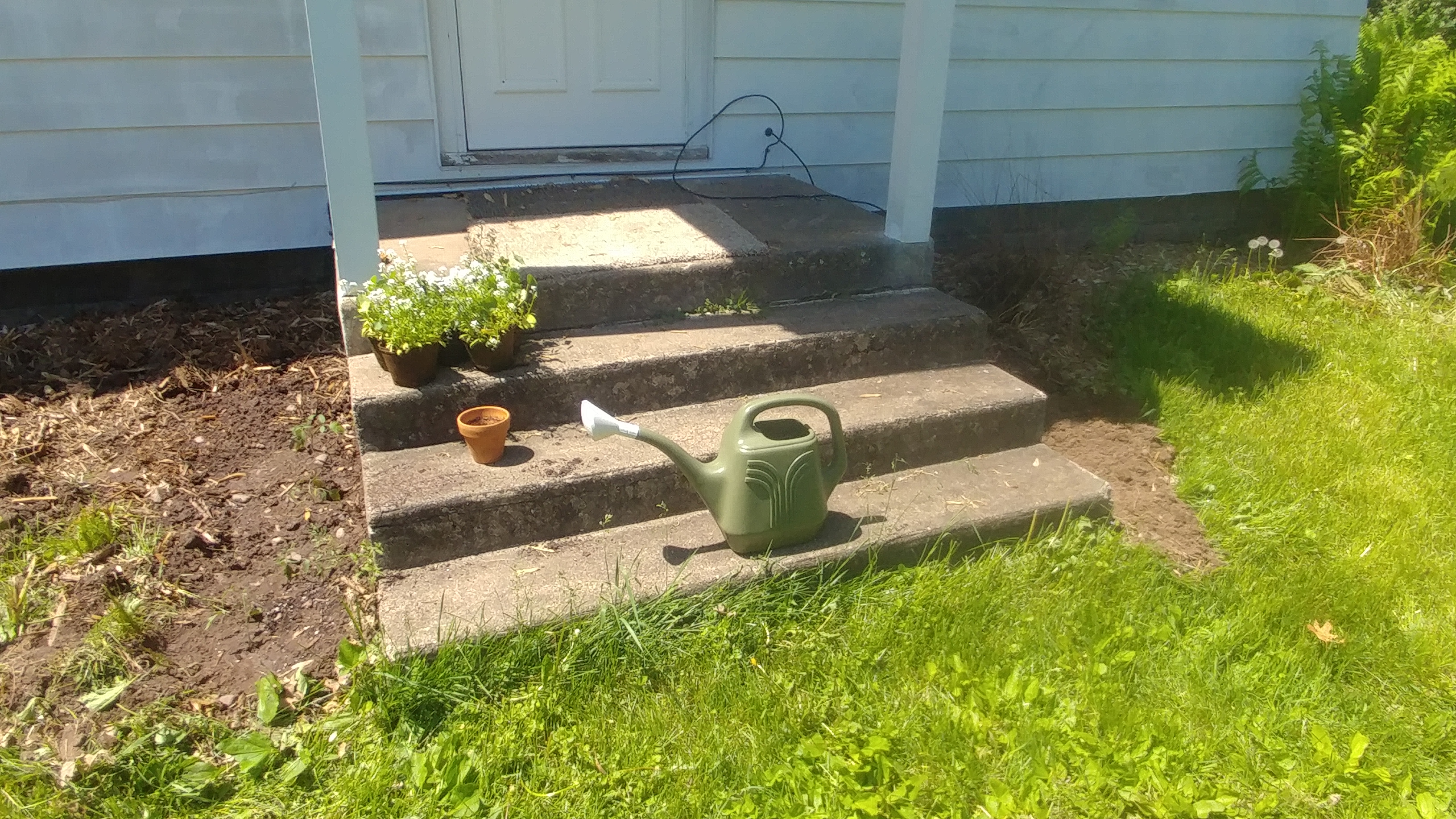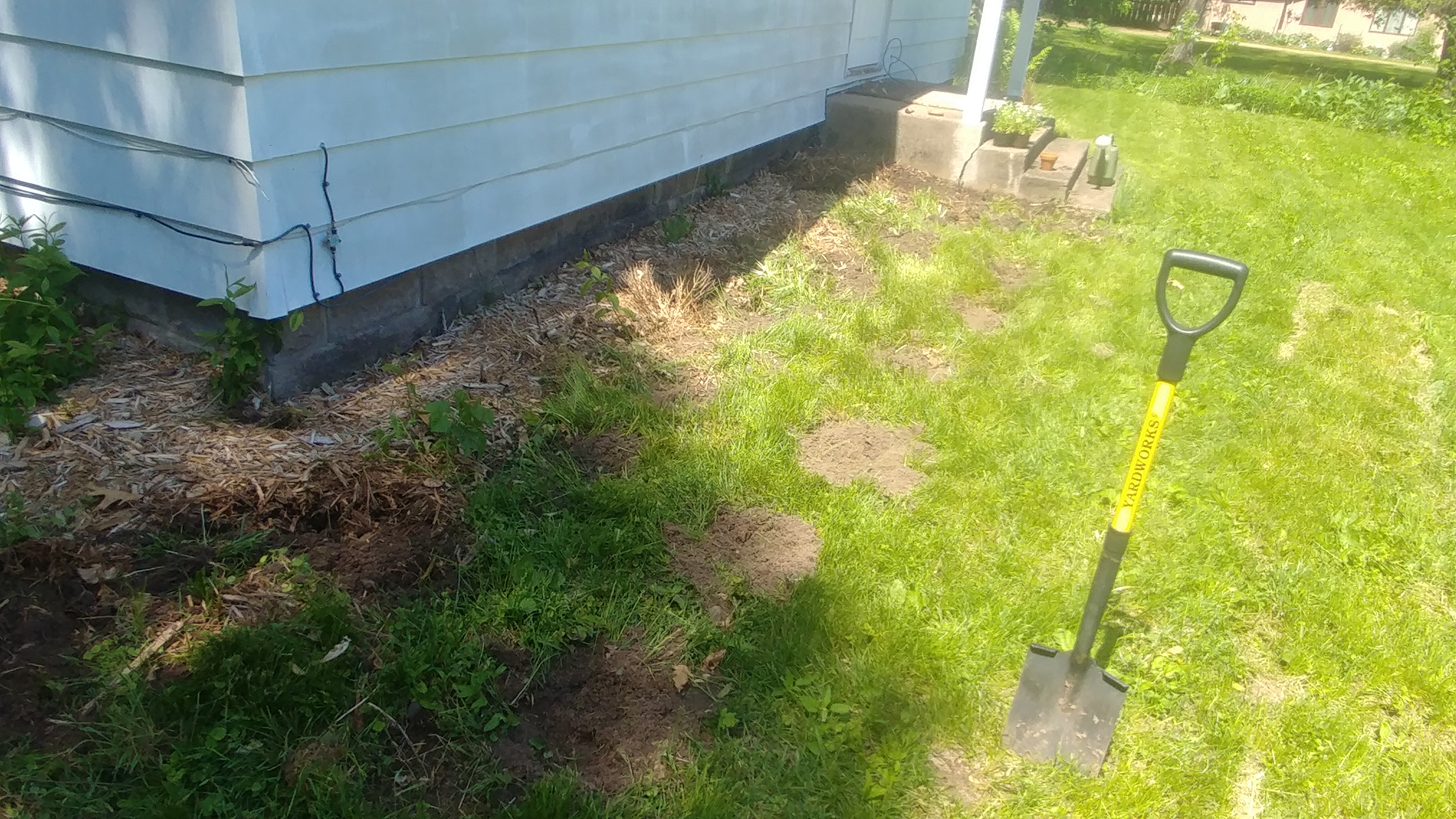 We dug a space for peppers on the right side of our porch, even though we're not sure we'll have a long enough season for them and we doubt they'll do well having not been started inside. On the left we transplanted four tomato plants Husband nursed in the apartment.