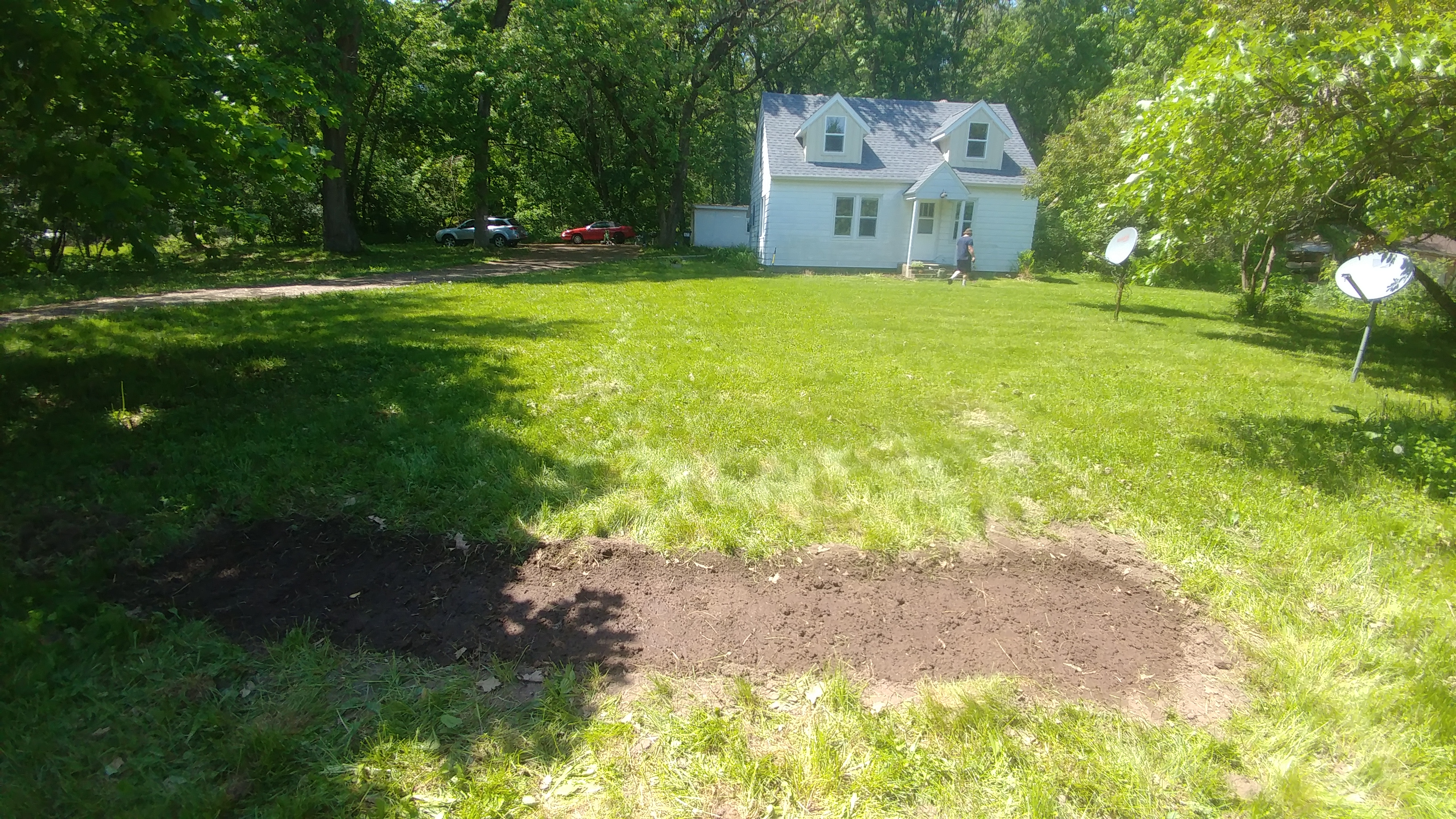 Finally, we dug spots for zucchinis and cucumbers along the front of the house to the left of the porch. We didn't turn up mounds to plant them; I don't know how that will effect the plants?