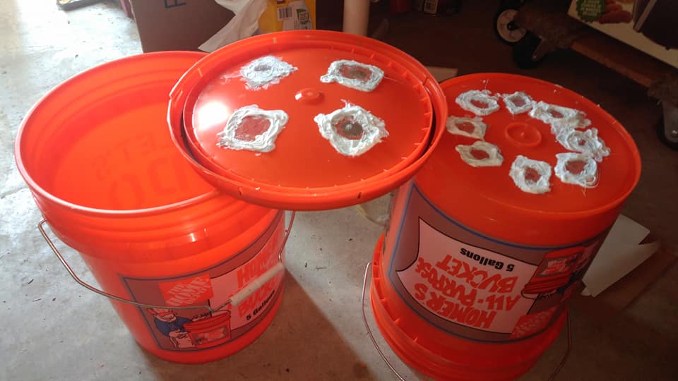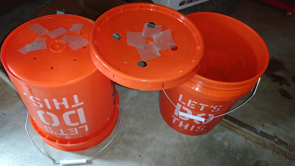 This project will need two 5 gallon bucket, a lid, a screw driver, scissors, waterproof caulk, plastic gloves and bug screen. Start by screwing some large holes in the lid for air ventilation. Secondly, one of the buckets needs small drainage holes drilled in the bottom. The other bucket will remain untouched as it is the reservoir for the worm tea.