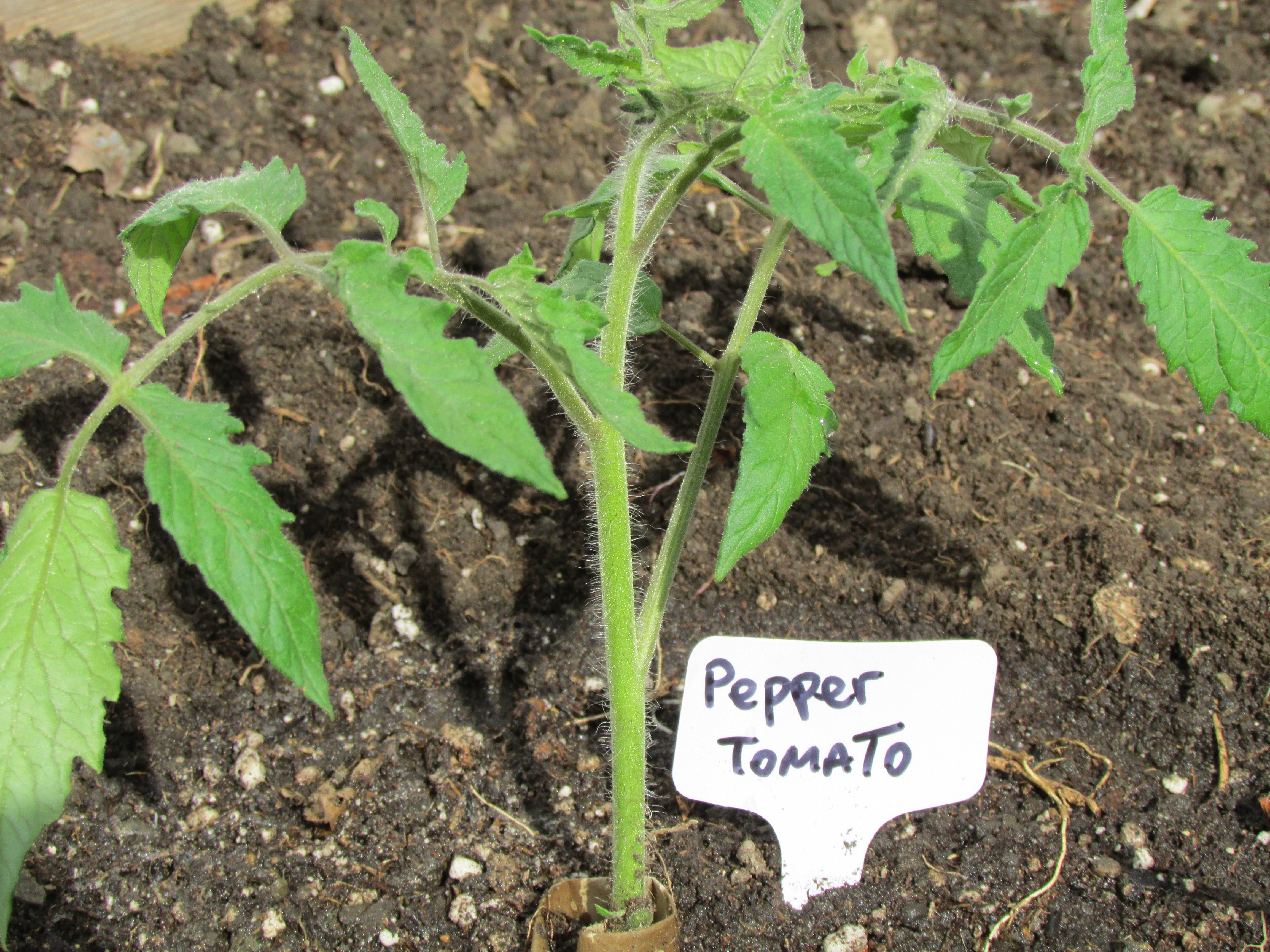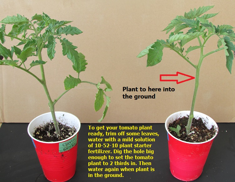 Dig a hole deep enough that you can set your plant two thirds into the ground. Always plant tomatoes deep .