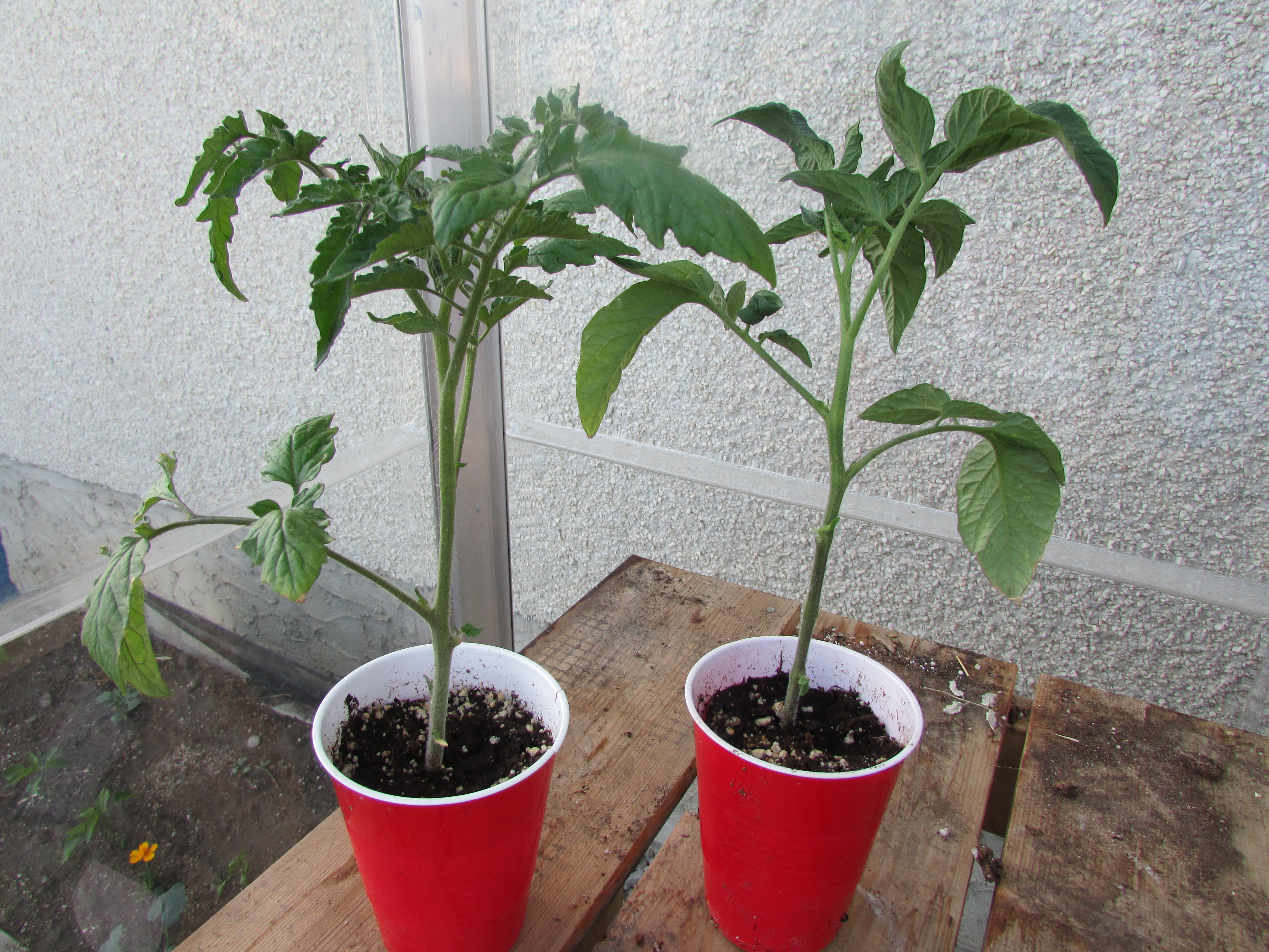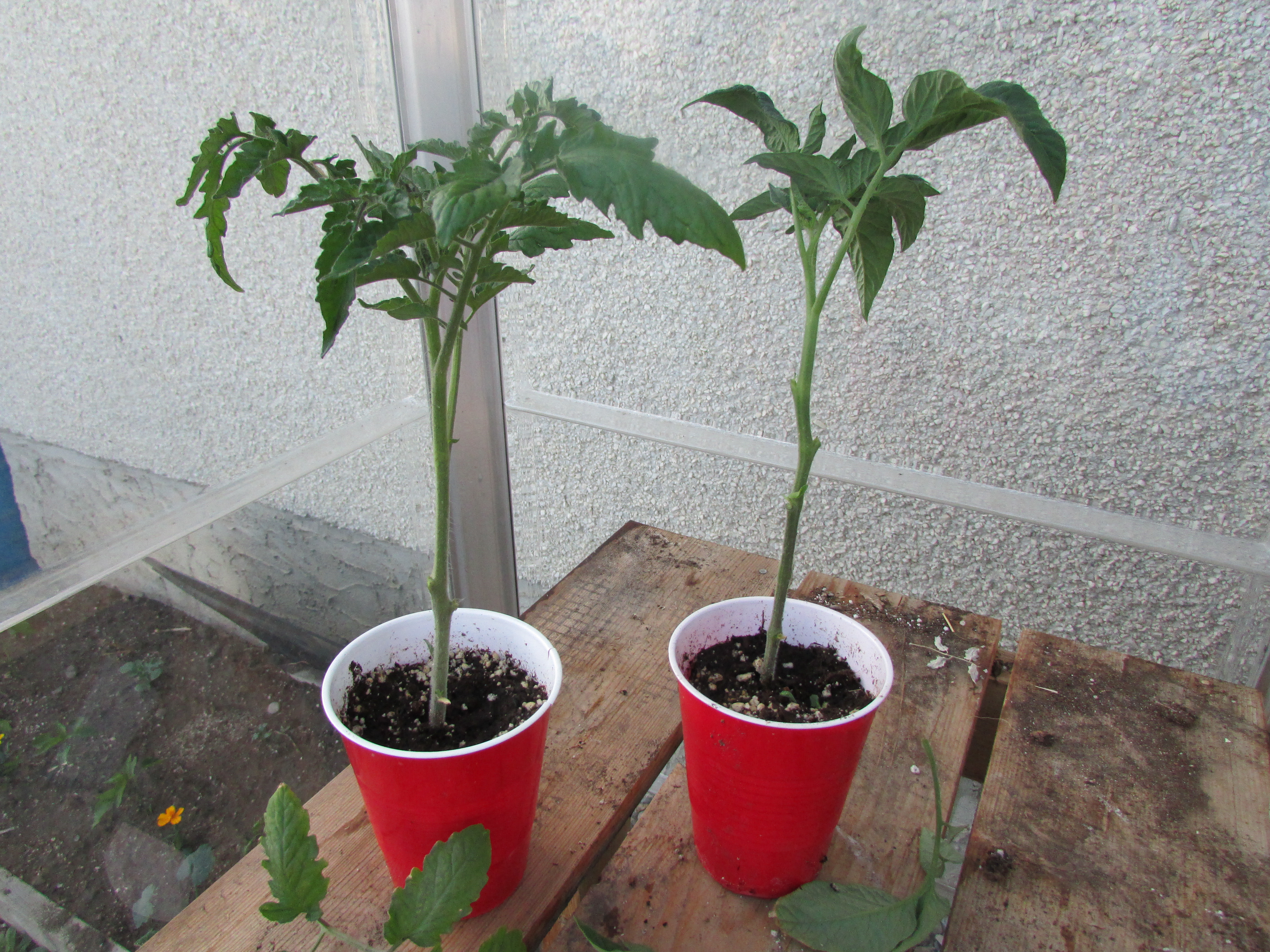 Here I have the two tomato plants that I will prune , take some sharp clean pruners or scissors and cut off the leaves . Leaving about one third of the plant with greens.