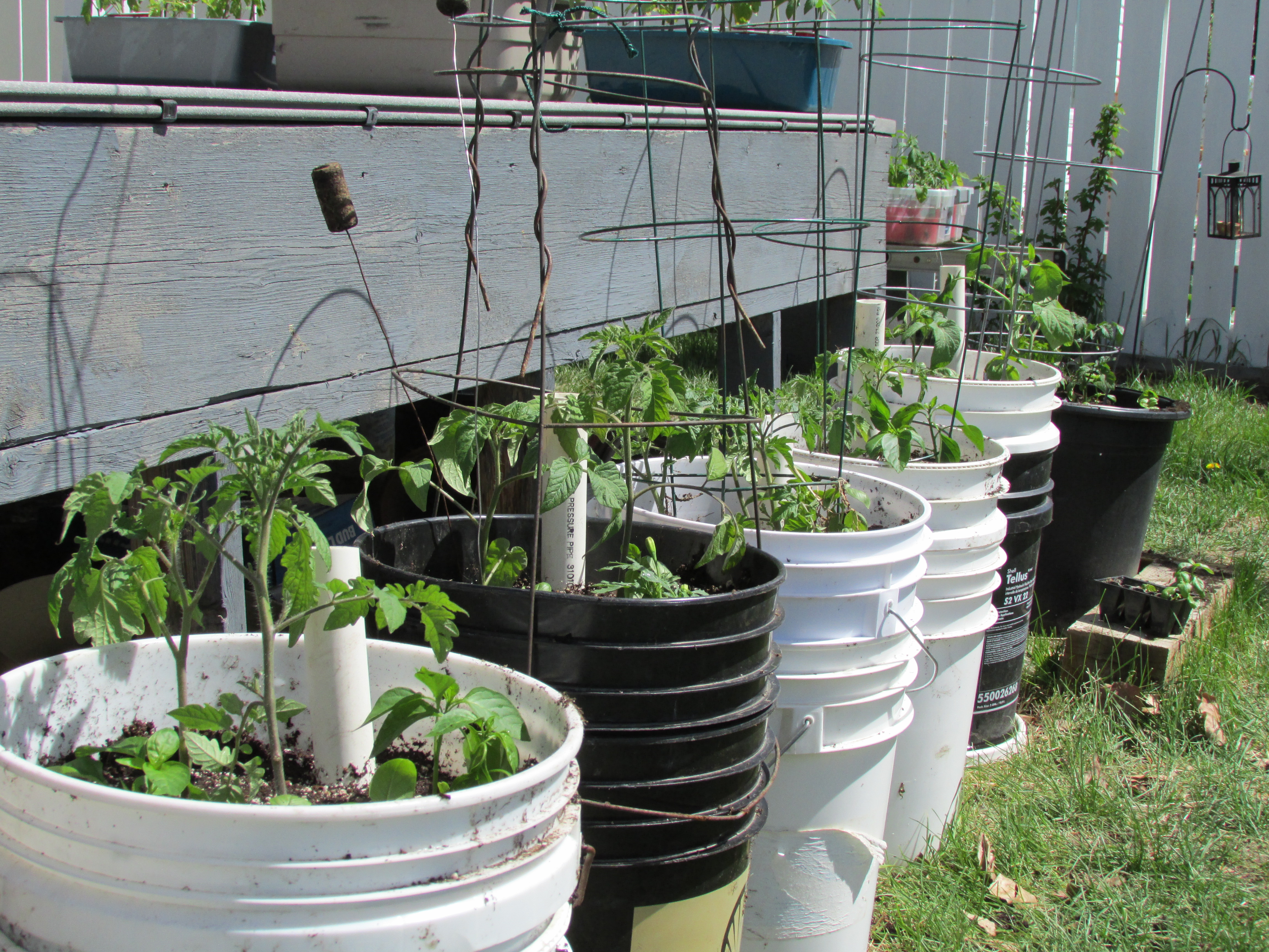 These buckets are made from 5 gallon pails that you can get most every where for free. They are easy to make and they will save you a ton of time in the watering department.