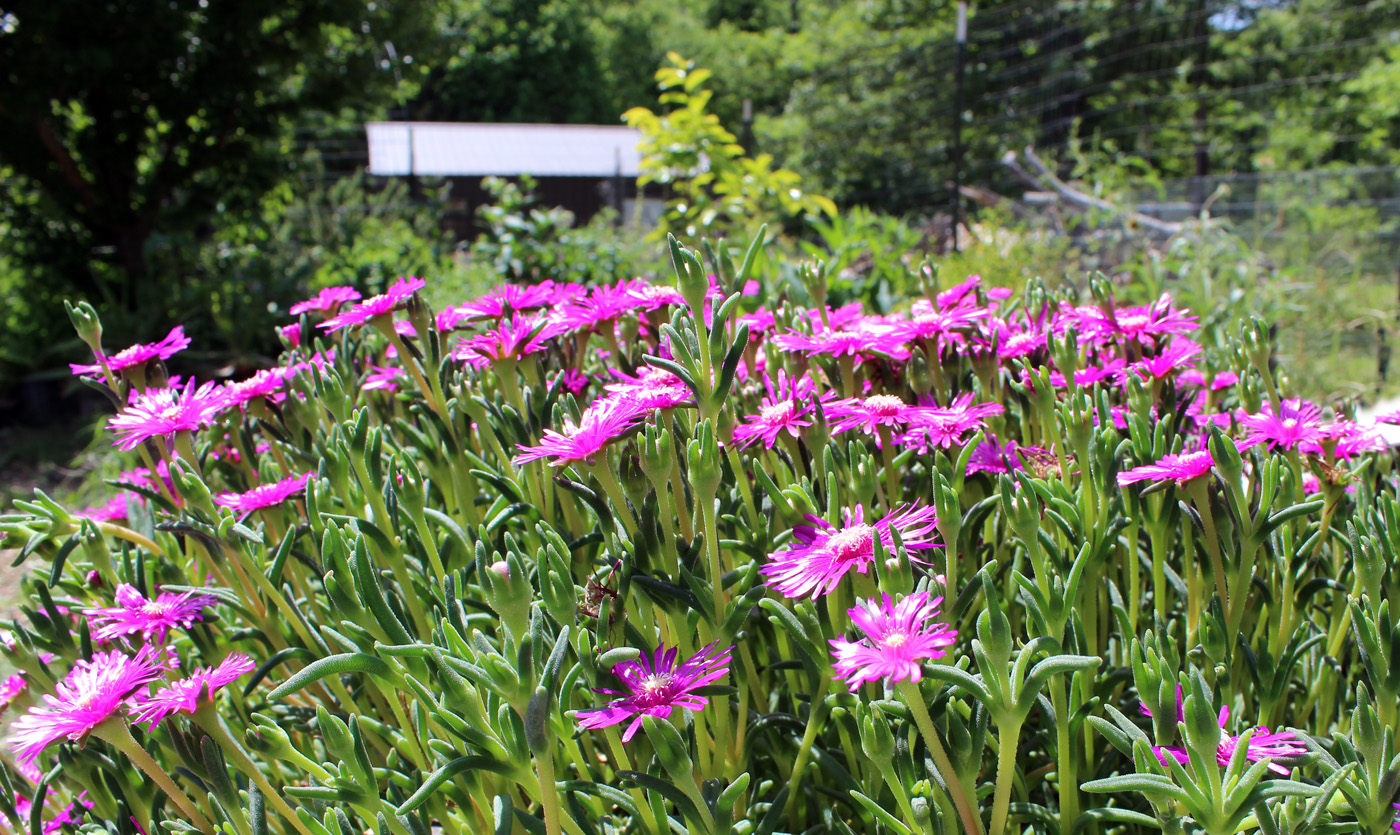 My husband and I ended up deciding on this hardy, low maintenance succulent known as “Delosperma cooperi Ice Plant”. Ice plant is native to South Africa and can be grown in USDA zones 5-9. This is a mat forming plant that gets about 3 inches tall. It has beautiful bright purple/red flowers that cover the entire plant and bloom mid Spring to Summer. The flowers are about 2 inches in diameter and are loved by butterflies and bees. I am amazed with the colors of blooms.