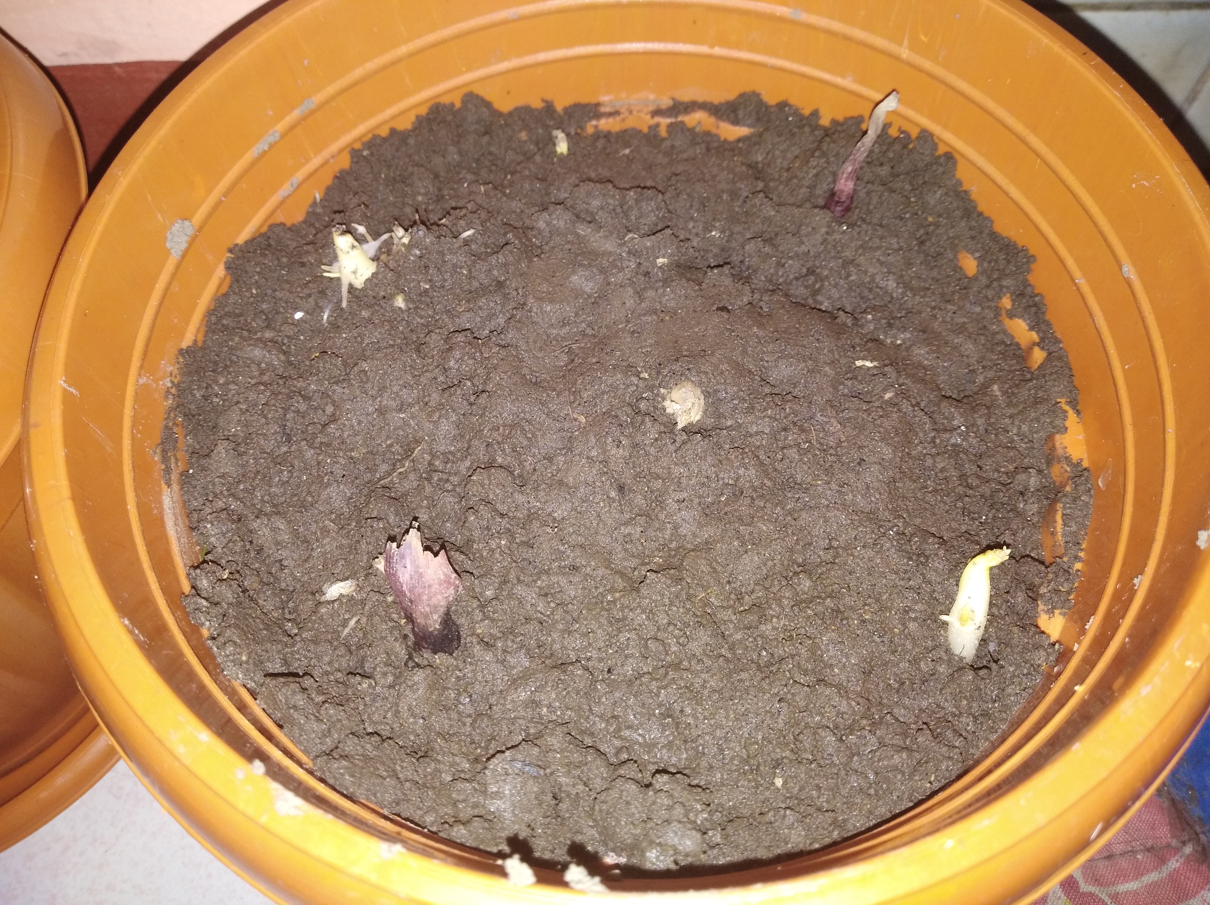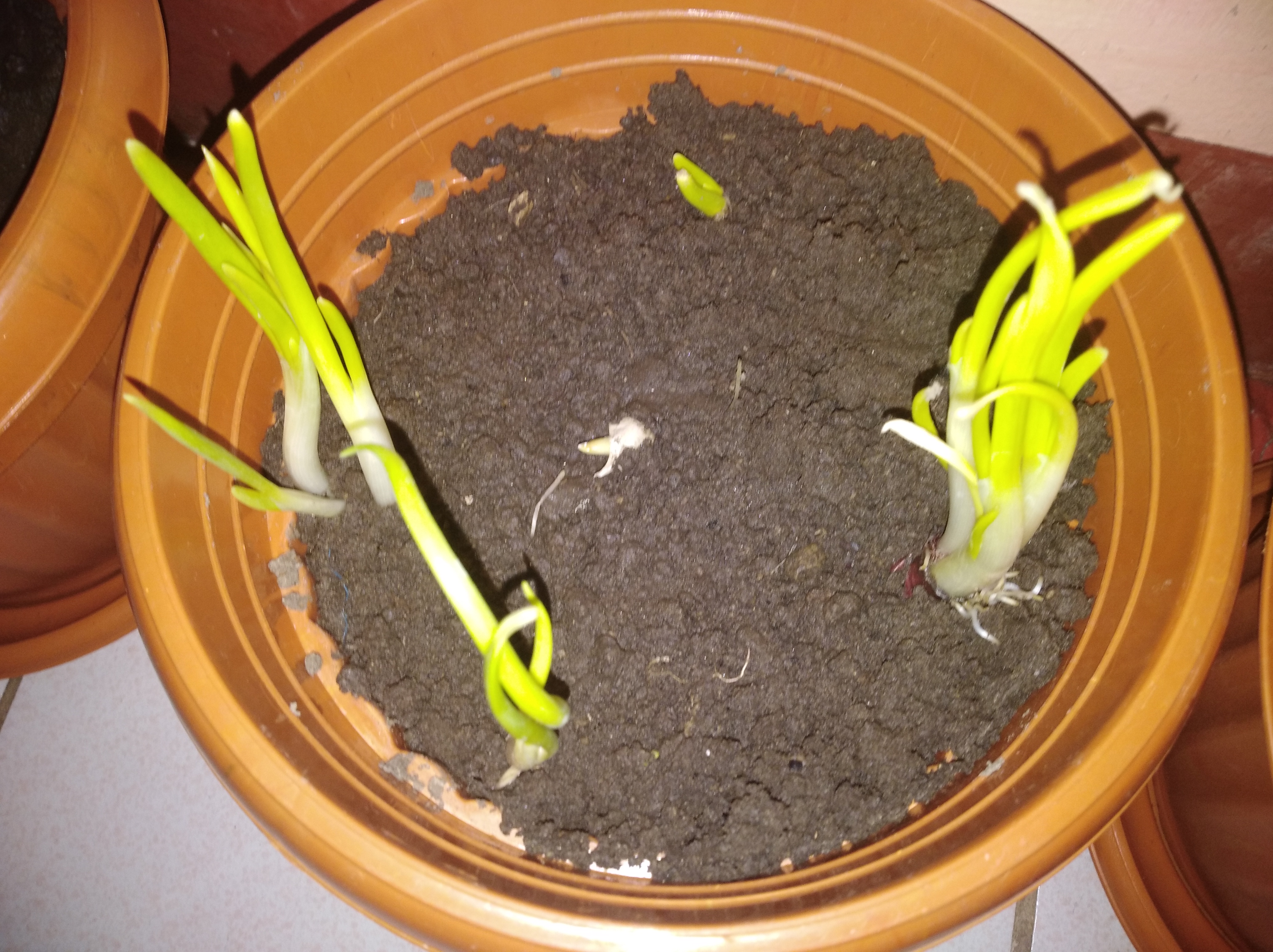 For our first "major" mom and daughter project, we transplanted our home-grown garlic, onion and potato seedlings to pots.