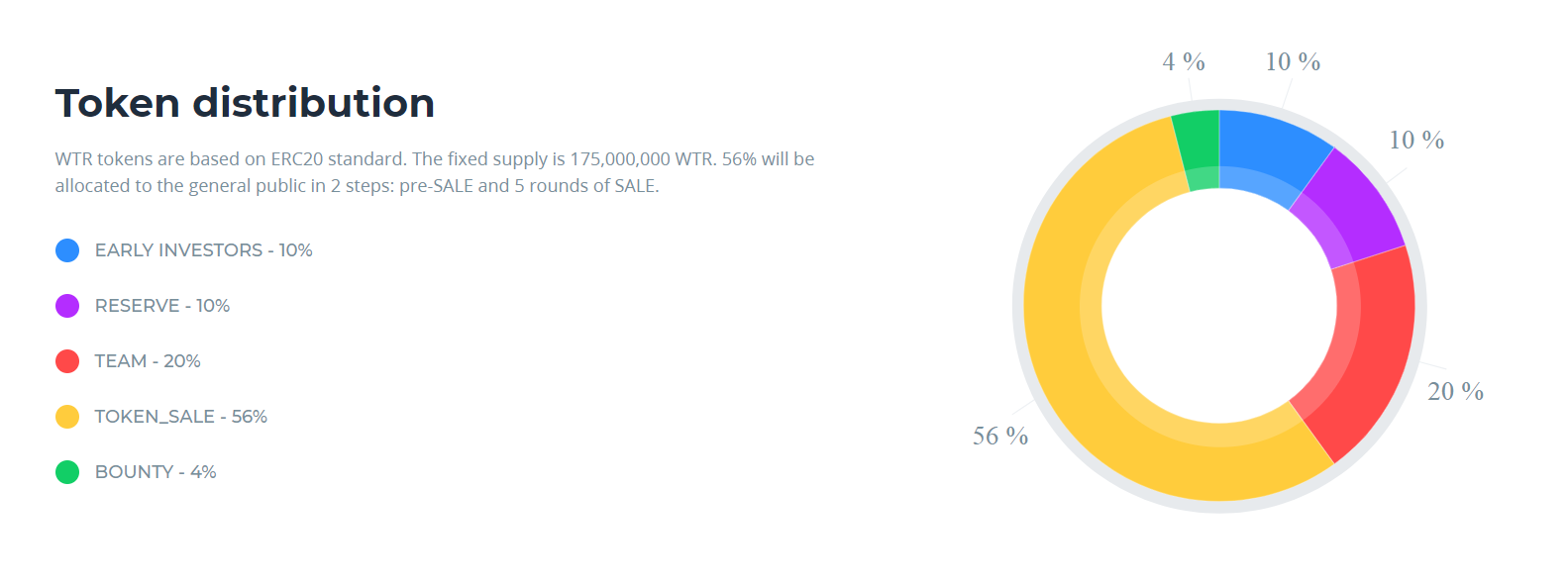Фиксированнае количество токенов WTR составит 175 000 000. После этого не будет создано никаких дополнительных токенов. Из общего количества токенов WTR 56% (98 000 000 токенов WTR) будут выделены для широкой публики двумя траншами: предварительная продажа и продажа. Токены WTR можно приобрести за ETH, BTC, BTH, LTC. Во время предварительной продажи токены WTR были продаваться со скидкой 50% и минимальным вкладом в 10 долларов США. Успешно достигнут хардкап присейла в количестве 8 000 000 токенов WTR (400 000 долларов США).