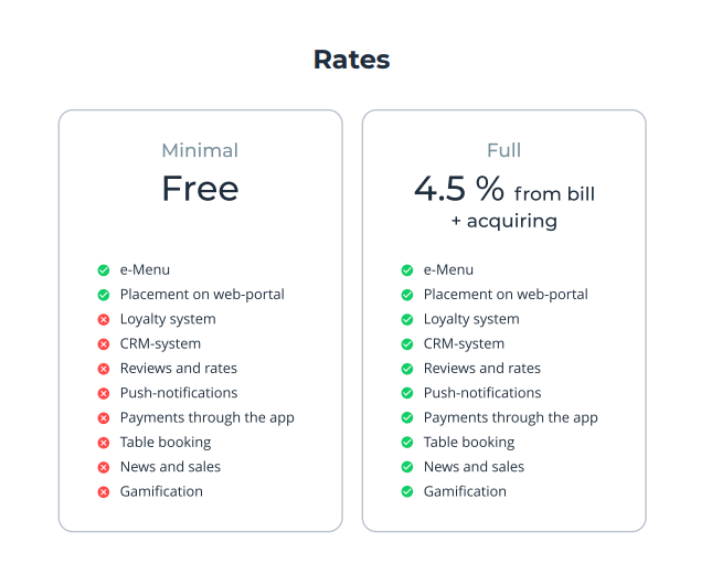 Свободное соединение означает добавление в датабазу ресторанов Gastery. При поиске в приложении такой ресторан будет показан как на карте, так и в списке. В ресторане появится собственная редактируемая страница, где все блоки будут управляемыми: фотографии, описание, адрес, контактная информация. Это будет бесплатный вариант, чтобы добавить меню в систему, чтобы все те, кто хочет посетить ресторан, могли его изучить. Тем не менее аналитика будет недоступна в случае такого бесплатного подключения к системе. Но никогда не поздно сменить тарифный план.