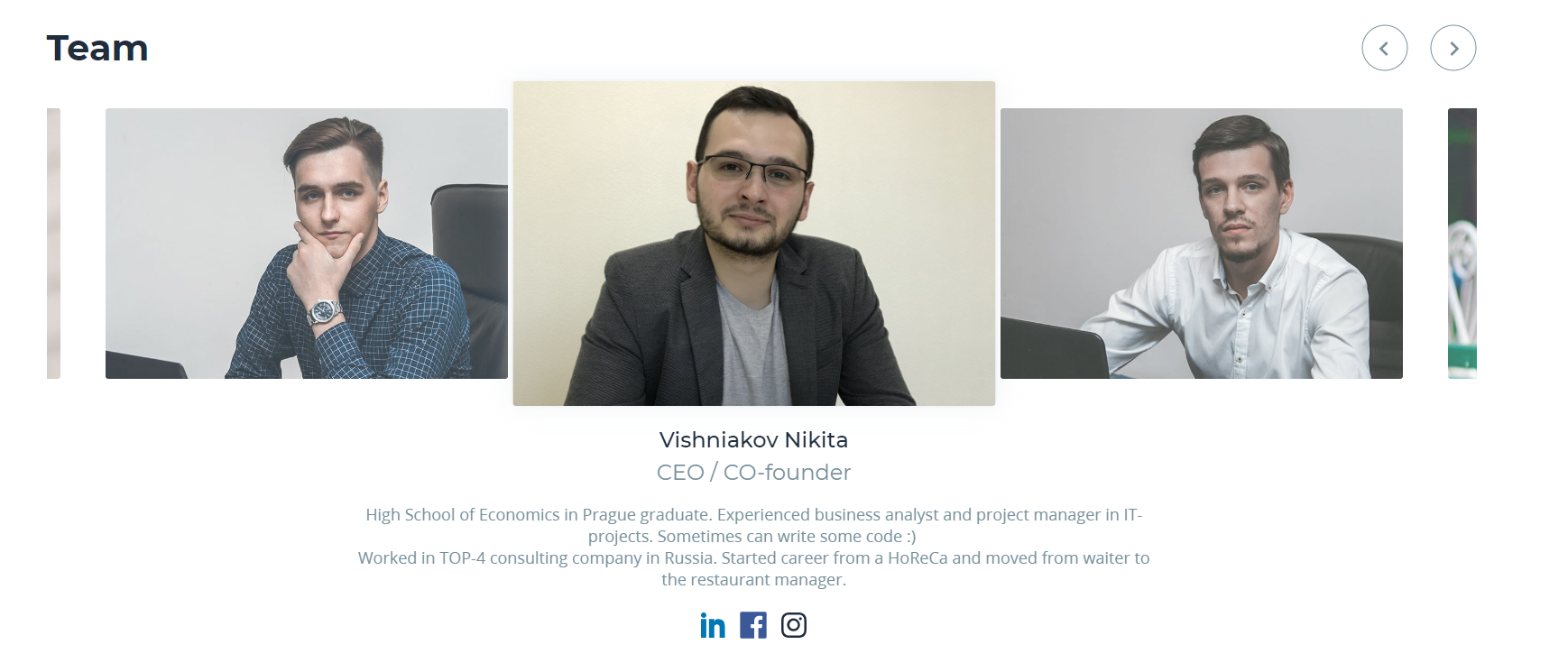 Nikita Vishnyakov CEO, Chief Executive Officer, имеет многолетний опыт как в индустрии HoReCa, так и в разработке приложений, так же работал около двух лет аналитиком в консалтинговой компании.